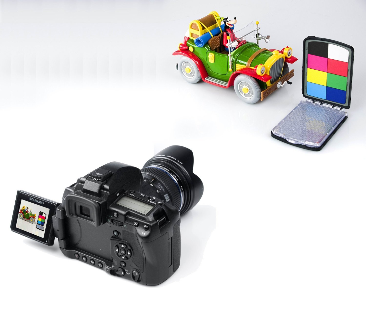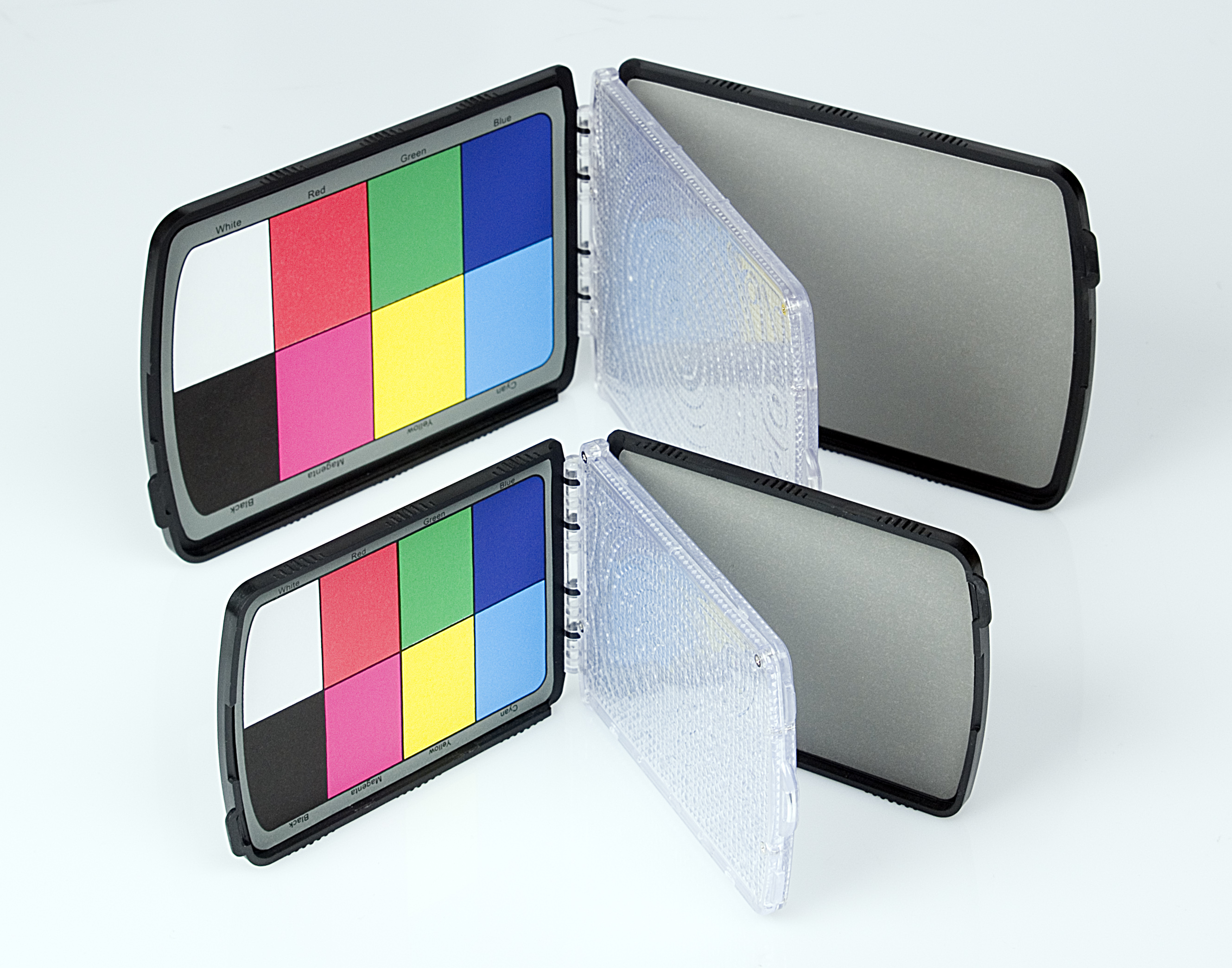 Colour card and grey card located in lower resp. upper cover. Translucent white balance filter with special surface pattern.