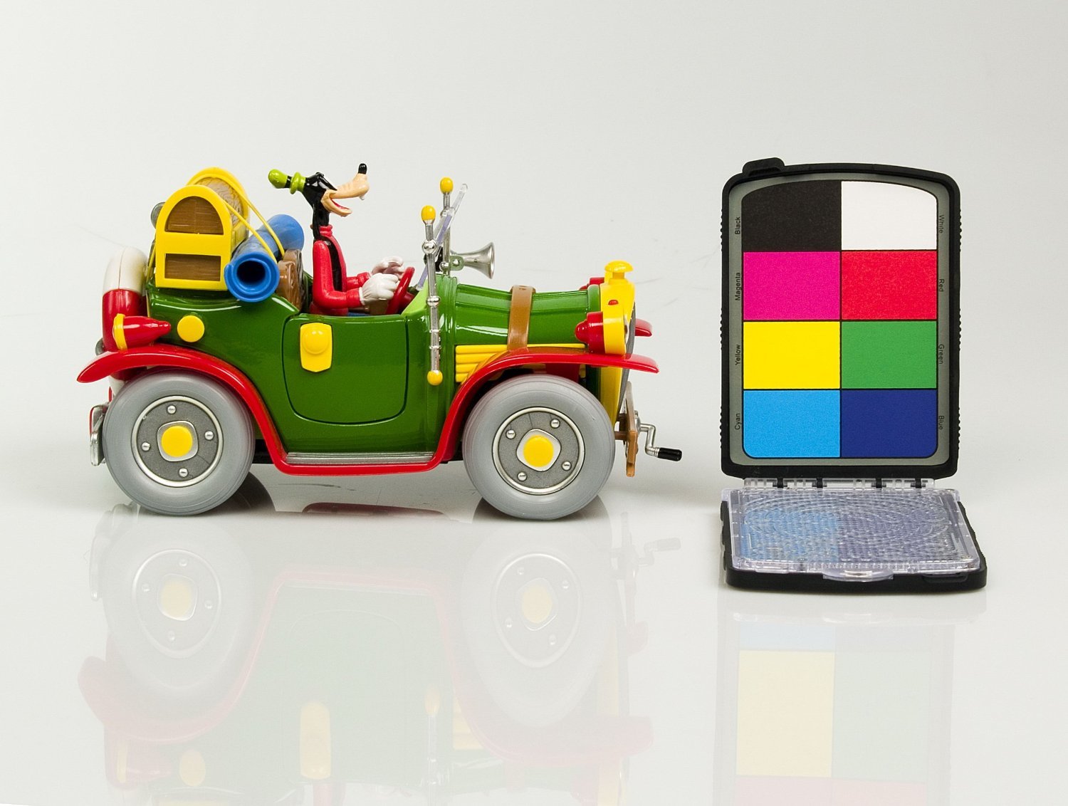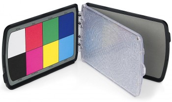 Combination of white balance filter, grey card and colour reference card in a slim, foldable plastic housing.