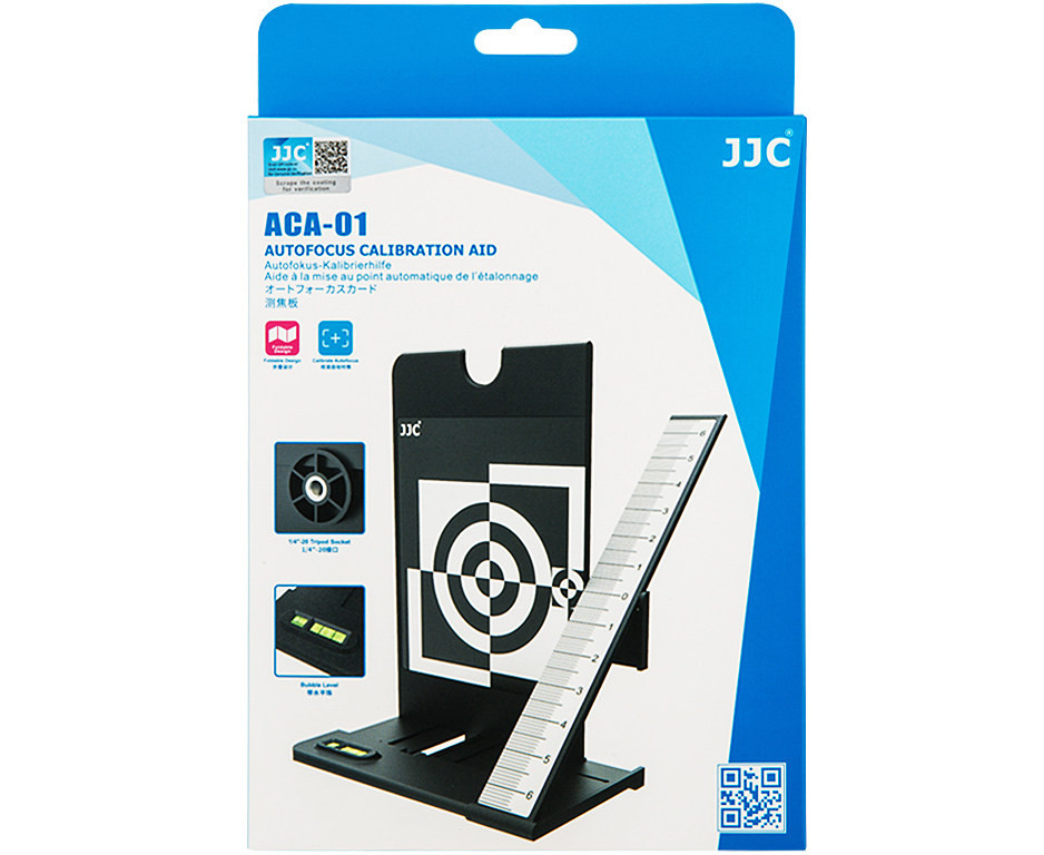 JJC ACA-01 Autofocus Calibration Aid is a focus test chart, which is specially designed for cameras with "AF Fine Tune" or " AF Micro Adjustment" function. It allows you to test the autofocus performance of your camera and helps you fine-tune the autofocus function of your camera and lens. The Autofocus Calibration Aid comes with a built-in bubble level for keeping itself on the level. It also features a 1/4"-20 tripod socket for mounting it on a tripod. JJC ACA-01 test chart will become a good partner for you to test the autofocus performance and fine-tune the autofocus function of your camera and lens.