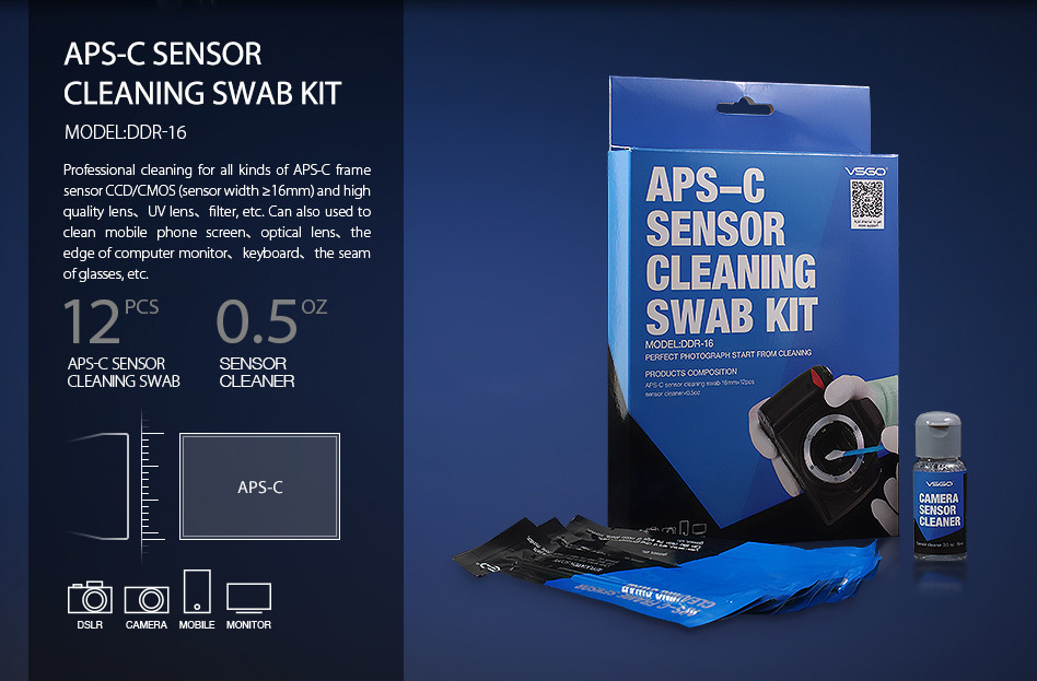 The VSGO APS-C Cleaning Swab Kit is a complete set for cleaning the APS-C sensor of your DSLR or system camera. This set contains twelve sensor swabs and a bottle of cleaning liquid of 15ml. The sensor swabs and cleaning fluid ensuring a thorough cleaning of the sensor, and are entirely safe to use.