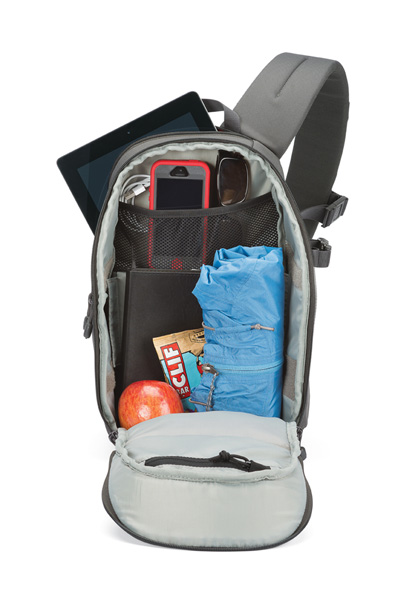 - Central flex divider provides an easy way to organize and separate camera and personal gear in main compartment; to change configuration, pull red tab and fold down