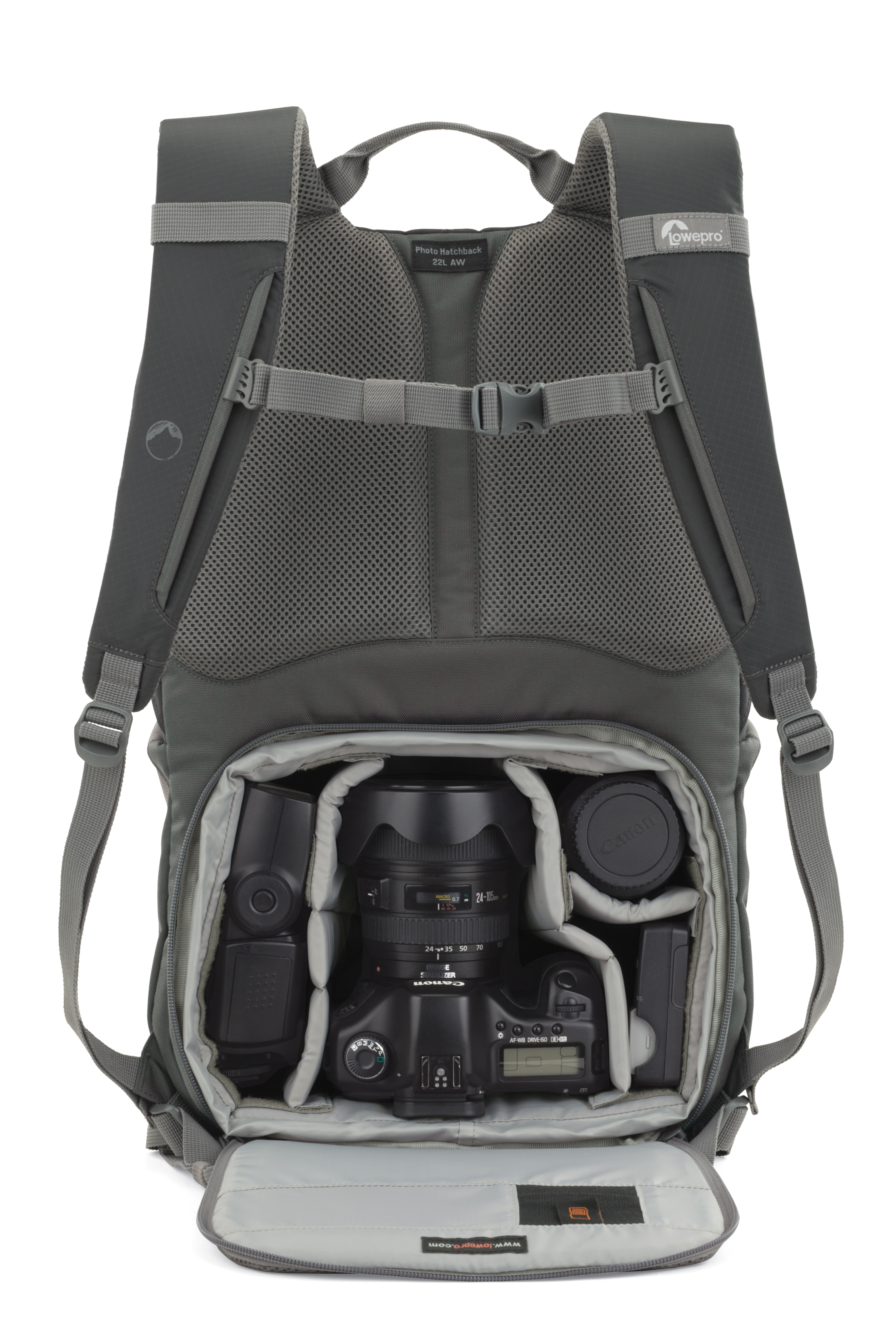 Maximize your carrying options for all-day adventures with the Photo Hatchback AW from Lowepro. It’s a backpack with flexibility built into lightweight, yet high-performance design. The “hatch” refers to the secure, body-side access. A removable camera box provides custom storage for photo gear and lifts out to convert to a fully functional daypack. A roomy upper compartment supplies quick access to creature comforts. Extra-handy features include: padded front panel with space for a tablet; tall, stretch-mesh side pockets for a water bottle or compact tripod; and a built-in All Weather AW Cover™ to protect your gear from the elements.