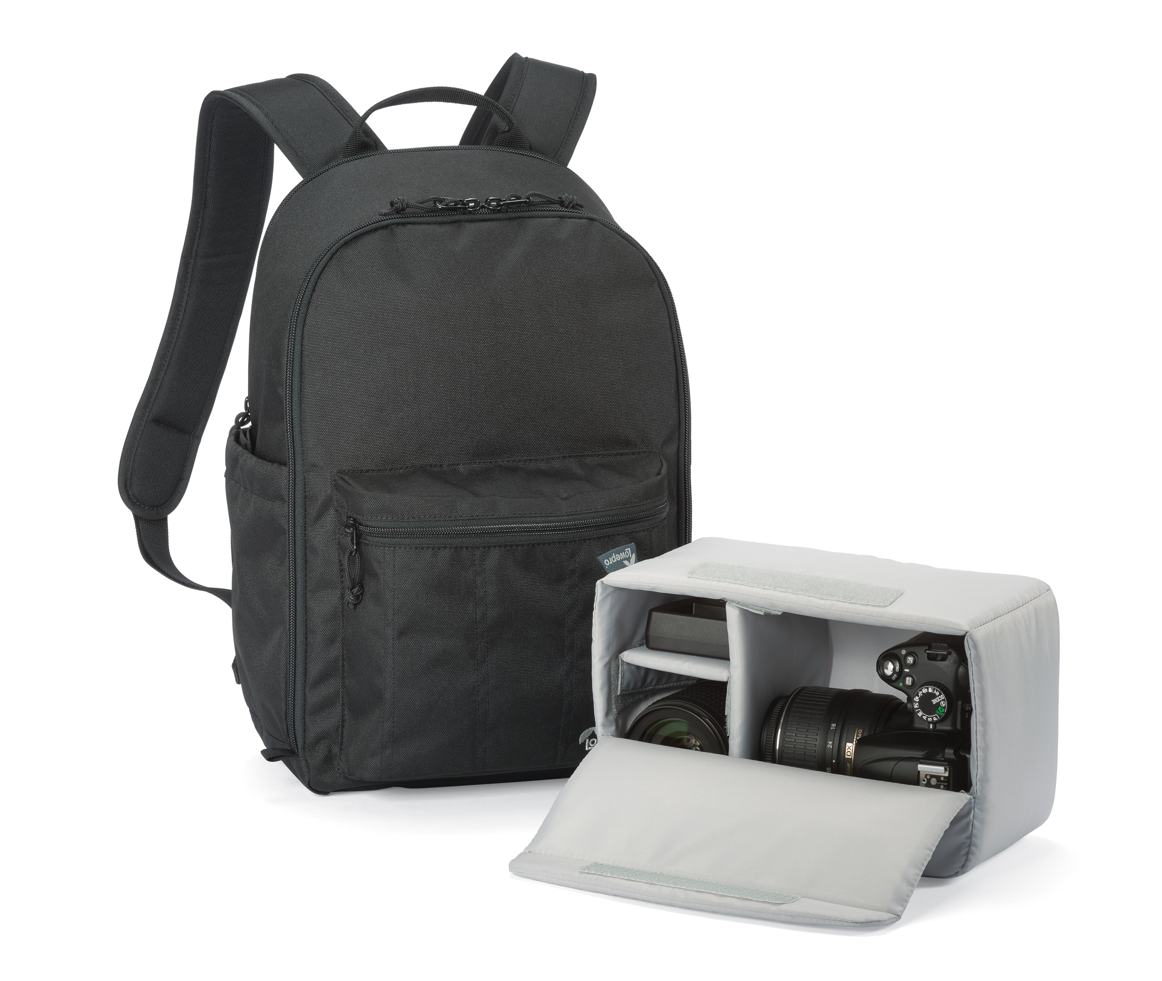 Padded, removable inner tray will fit a DSLR camera or systemic. A specific partitions can change the removable tray sections size and layout.