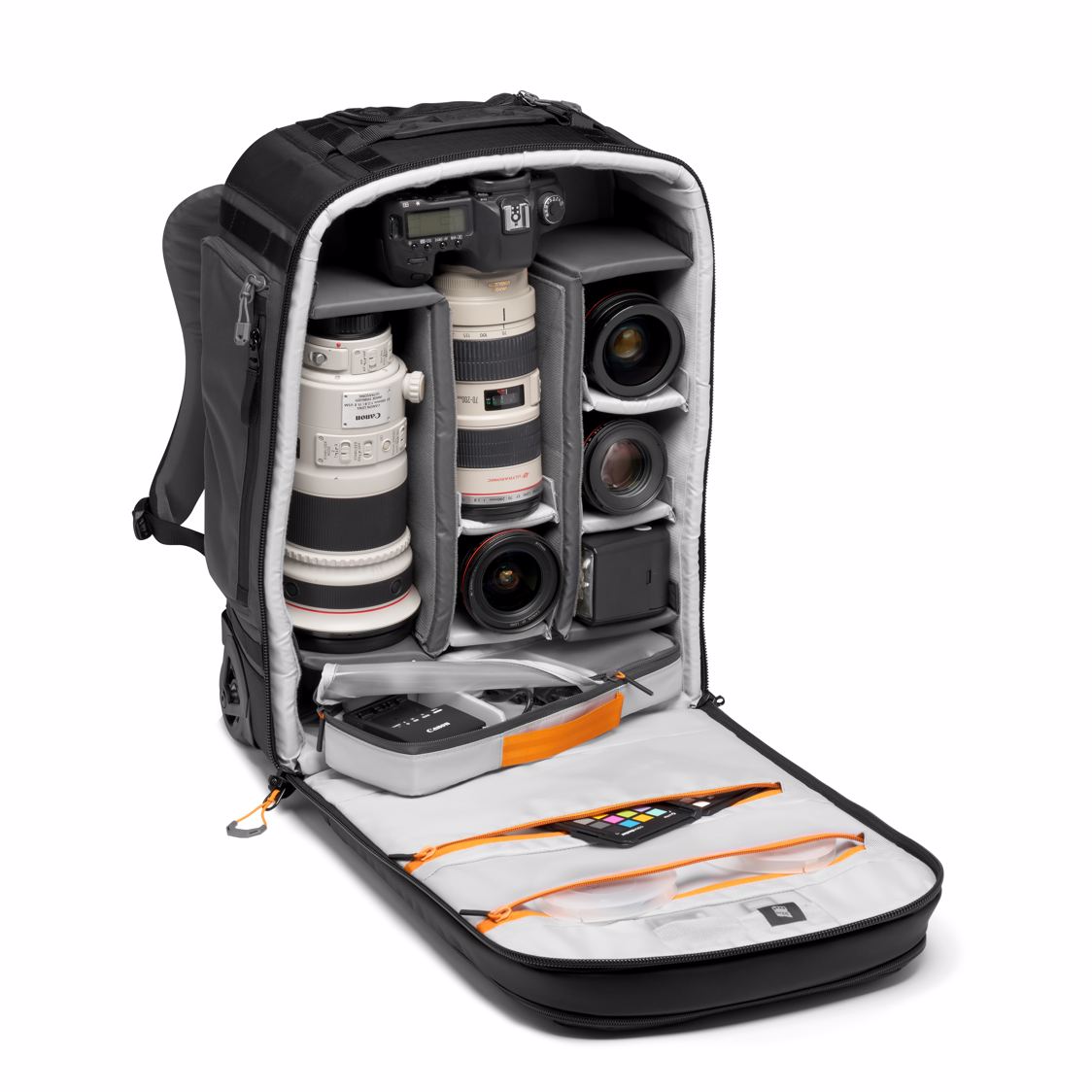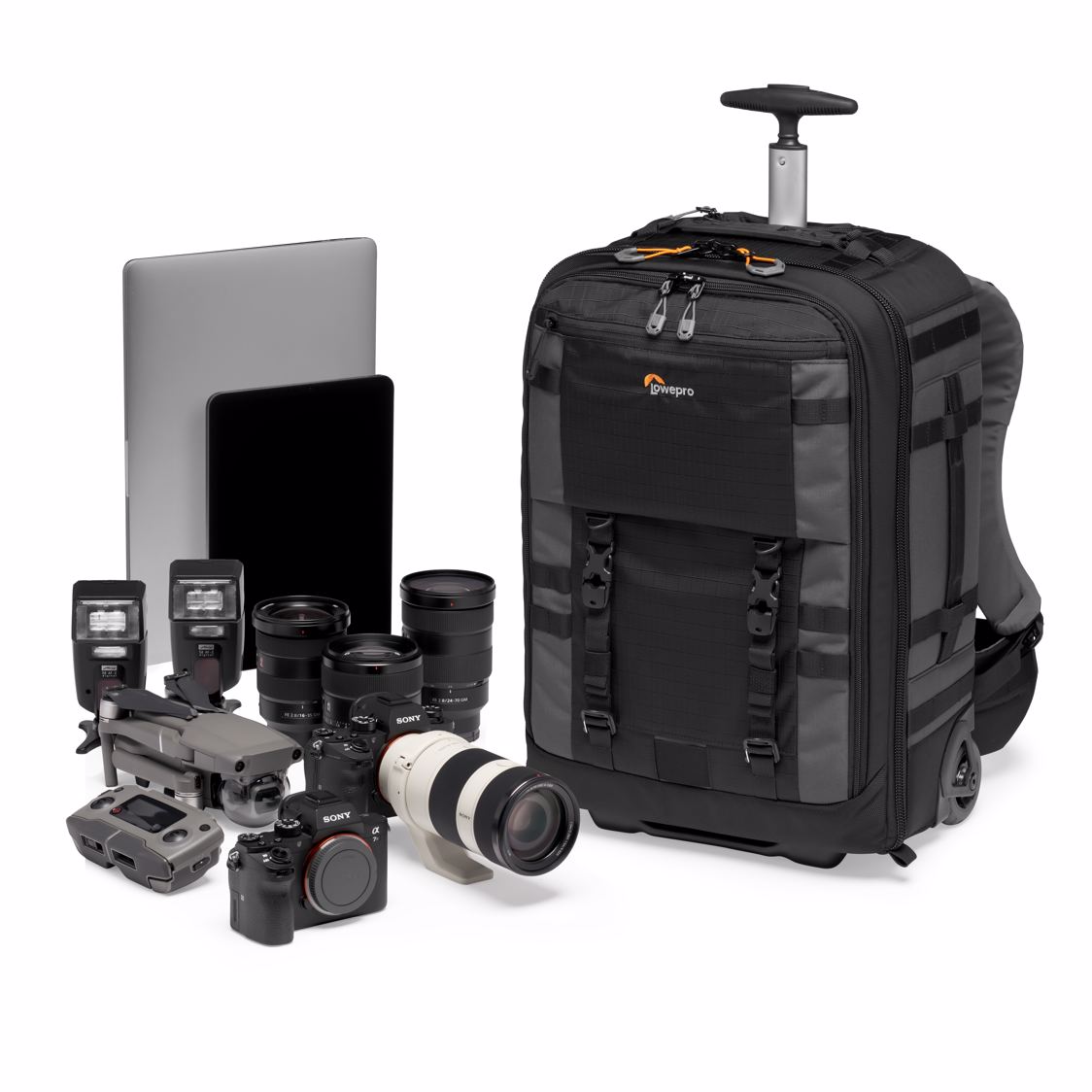- A professional full-frame DSLR (such as Canon EOS 1D / 5D with vertical grip) or pro mirrorless (Sony A9) with 70-200mm f/2.8 attached, a 300mm f/2.8 lens + 3-4 additional lenses / speedlights. Or instead of 300mm f/2.8 you can fit 2 pro DSLRs + 4-5 lenses / speedlights.