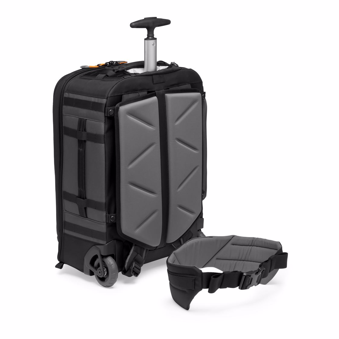 - Harness stows in back panel for easy carry-on handling