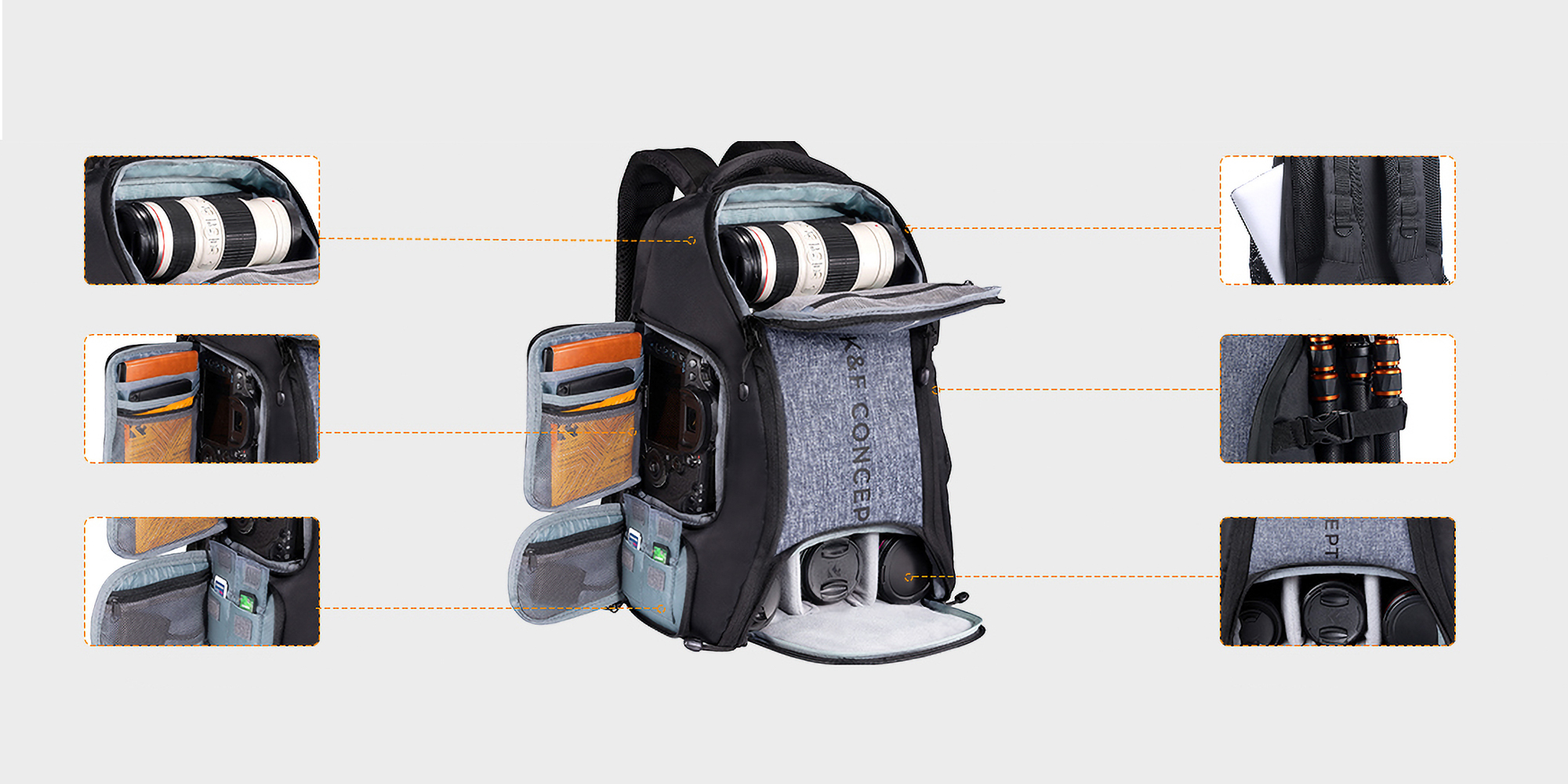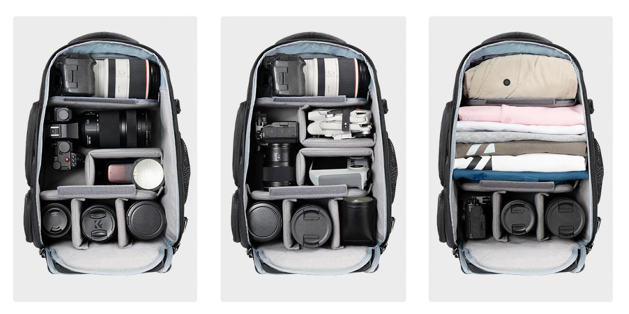 With a capacity of 25 liters, the K&F Concept Camera Backpack is a true command center for the photographer, vlogger or filmmaker. Thanks to the 3-level organization of the interior, you have full control over how you store your devices. The top compartment is perfect for transporting a large lens or drone. The middle compartment will successfully accommodate two cameras or additional lenses. The bottom compartment will provide space for three lenses or one camera with extra glass. It is up to you to decide how you will use the available space. Adjustable compartments will allow you to adjust the interior of the backpack to suit a wide variety of needs.