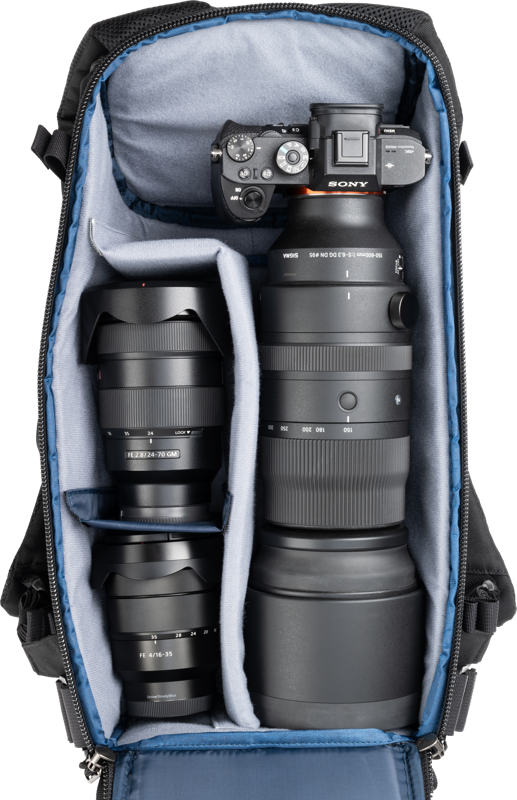 Regulējamas starpsienas, kurās var ievietot lielus teleobjektīvus, tradicionālo foto aprīkojumu vai personīgajiem priekšmetiem