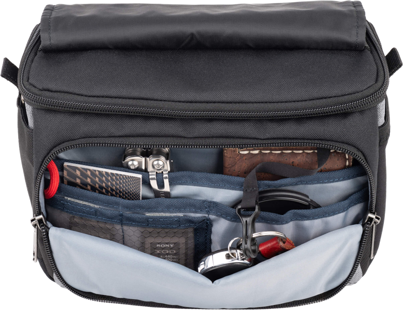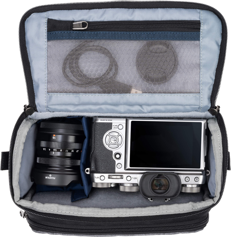 KAS IETILPST ŠAJĀ SOMĀ? Ietilpst viens standarta bezspoguļa kameras korpuss un 1 līdz 2 objektīvi: īsi līdz vidēji lieli f/4 tālummaiņi vai īsi līdz vidēji lieli objektīvs.