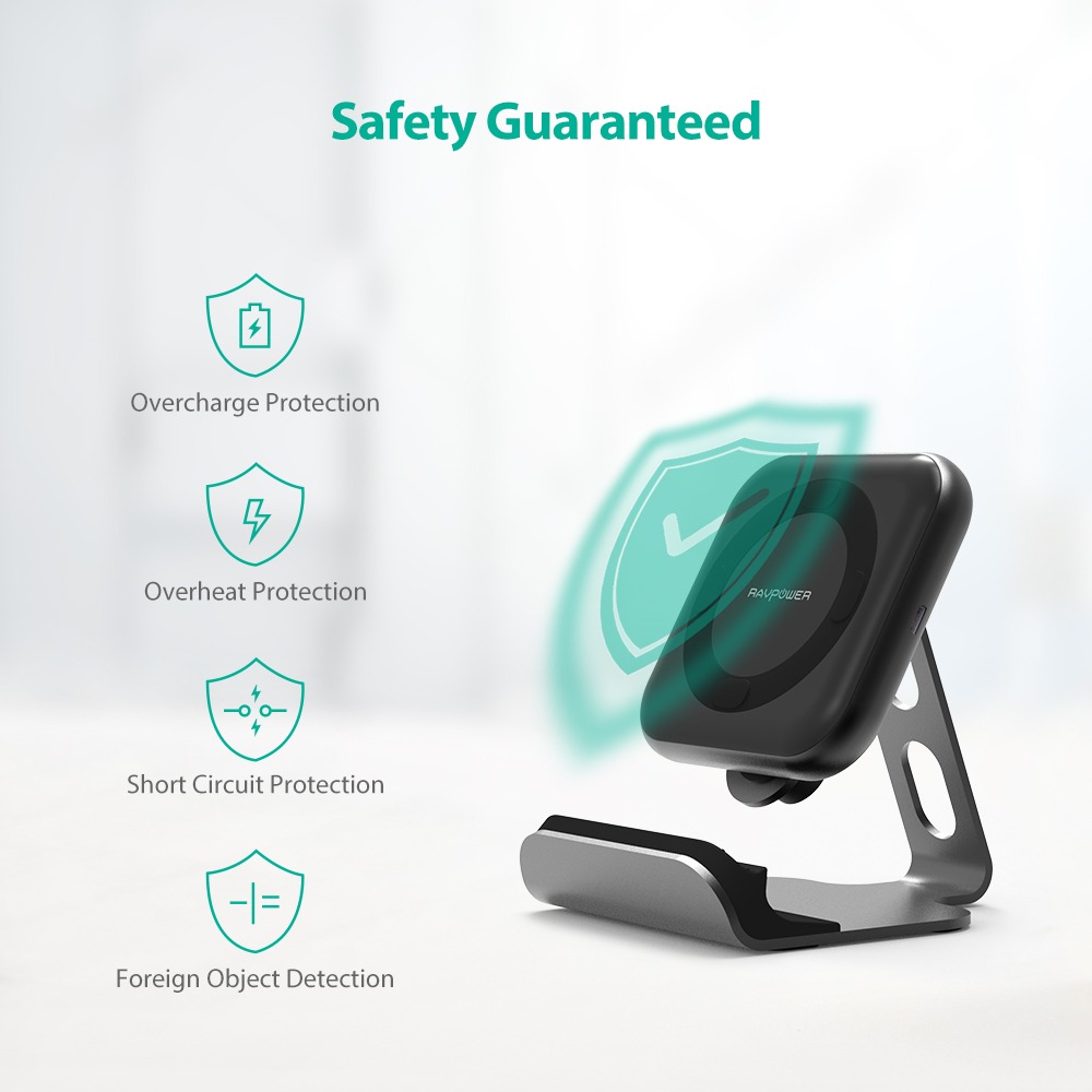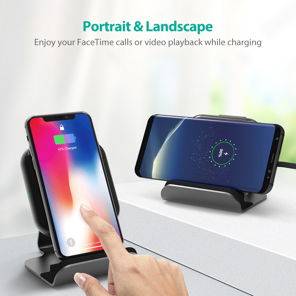 This charging stand is fast charge compatible with iPhone and Samsung devices up to 7.5W and 10W of power respectively. Recharge your smartphone in portrait or landscape mode so you can enjoy your FaceTime calls or video playback while you power your smartphone. Furthermore, this charger features overcharge, overheat and short-circuit protection, as well as foreign object detection.