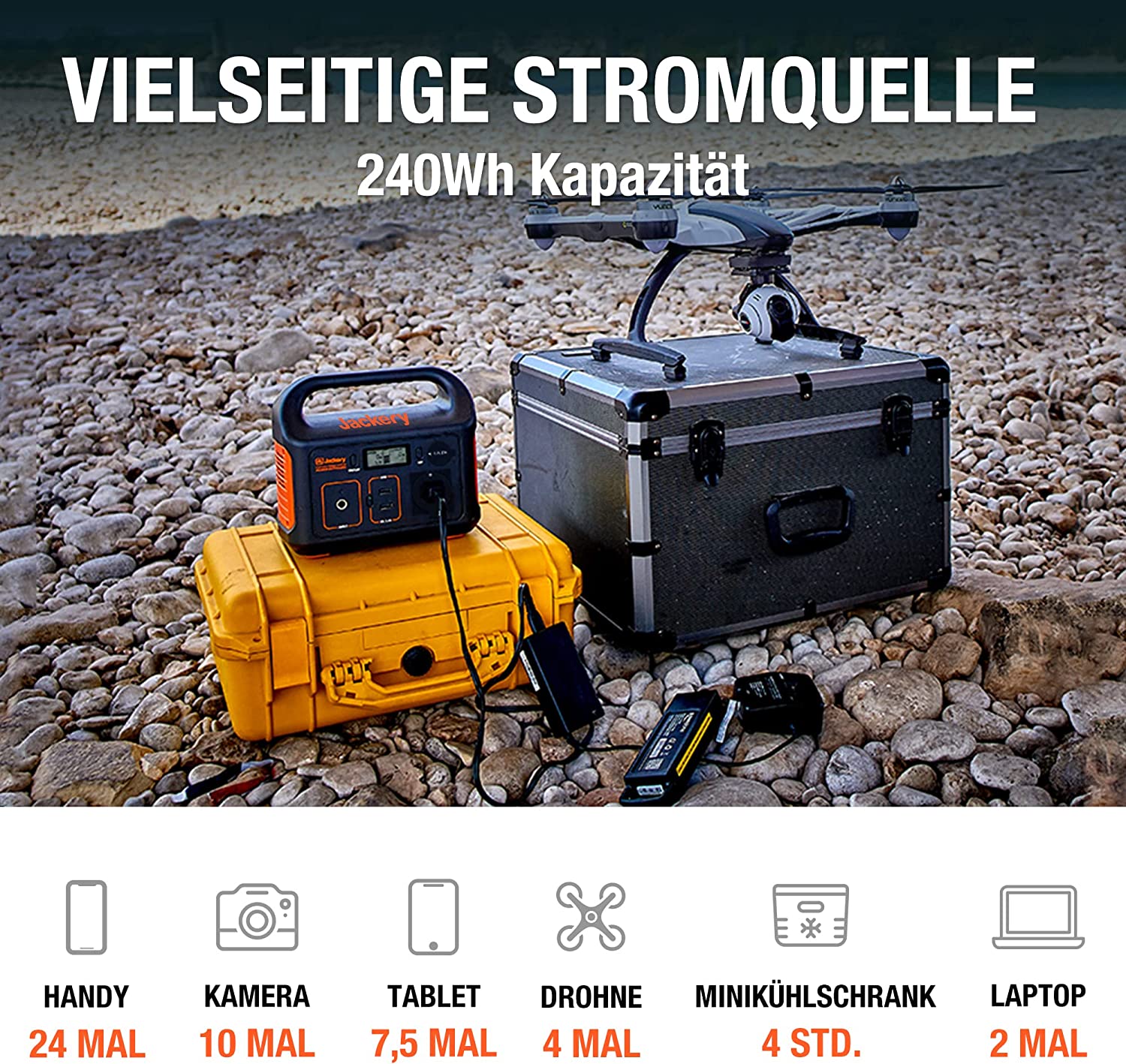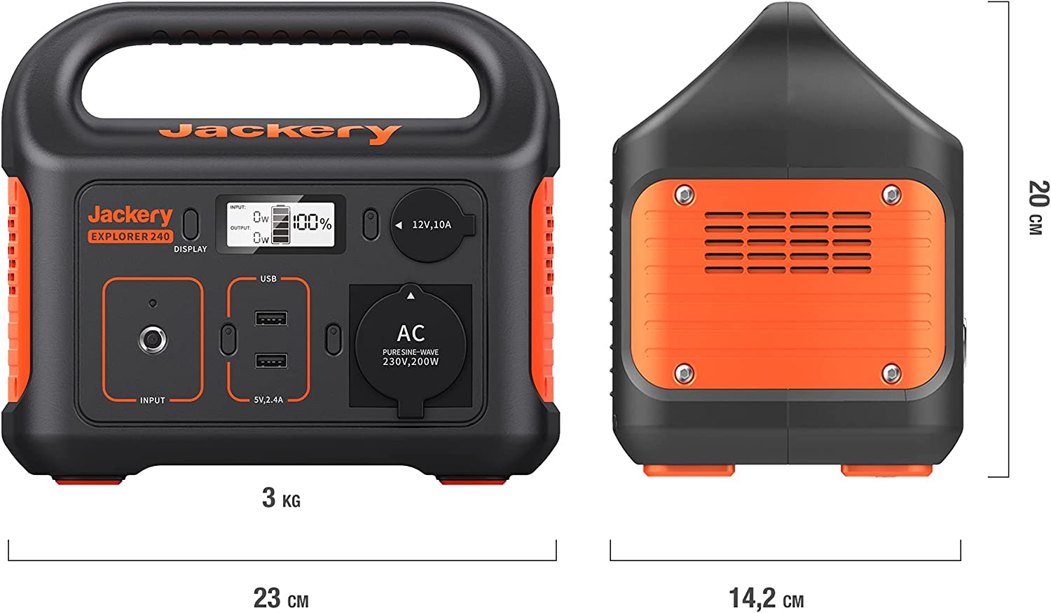 Jackery has sophisticated technology to ensure the stability of the products. - - Box contents: 1 x Jackery Explorer 240 portable power station (solar panels not included), 1 x power supply, 1 x car lighter, 1 x user manual (English language not guaranteed)