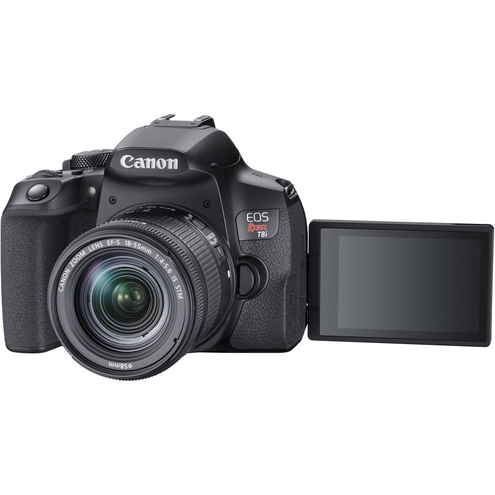 Designed for first-time shooters, but capable enough for advanced imaging tasks, the Canon EOS Rebel T8i is a versatile DSLR with well-rounded photo and video capabilities. Featuring a 24.1MP APS-C-format CMOS sensor and DIGIC 8 image processor, high-resolution stills and UHD 4K video recording are supported, along with a wide ISO 100-25600 sensitivity range to suit working in a variety of lighting conditions. Benefitting the imaging attributes, the sensor's design also facilitates Dual Pixel CMOS AF, which uses phase-detection autofocus for quick, accurate, and smooth focusing performance when recording movies or shooting stills in live view. When shooting stills using the optical viewfinder, a 45-point all cross-type phase-detection system is used for quick and accurate focusing in a variety of shooting scenarios.