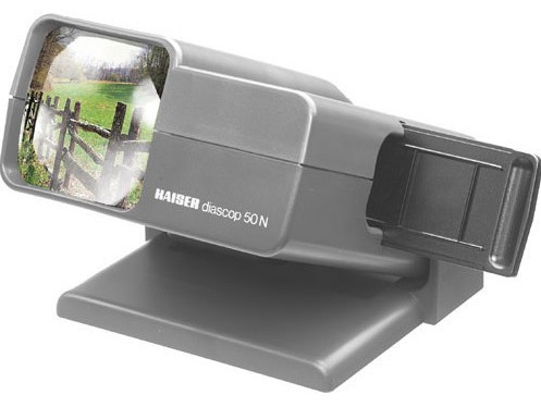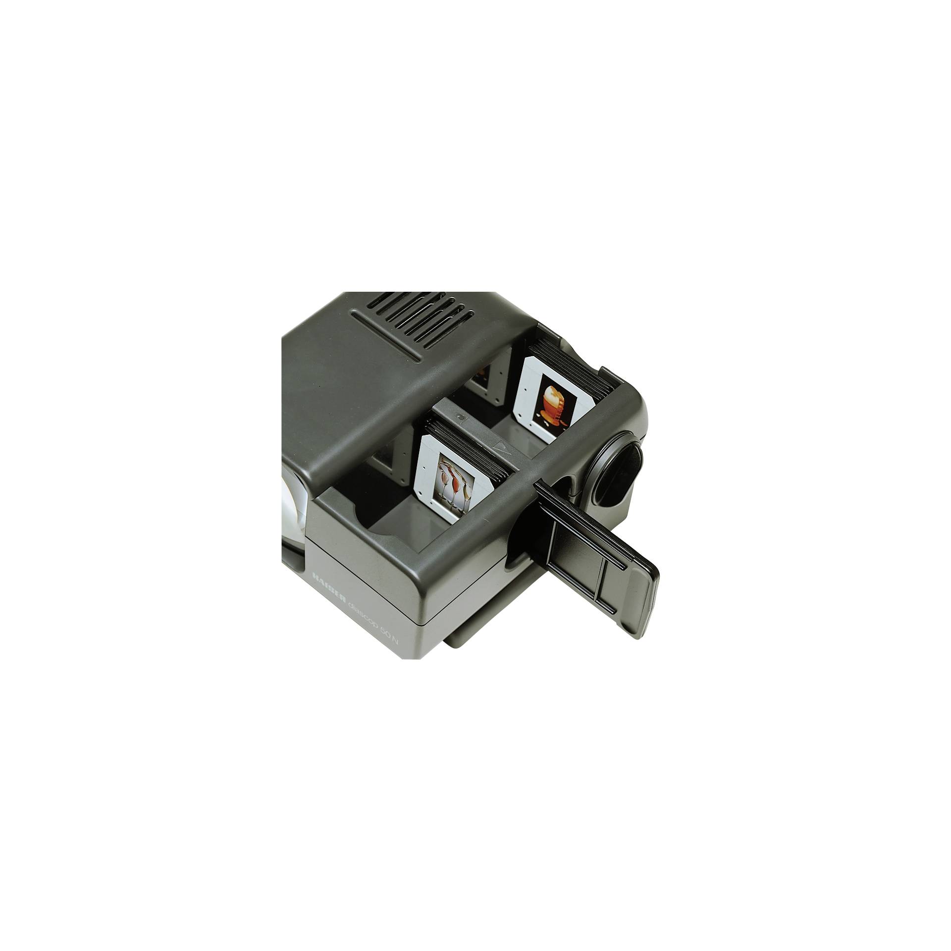 Slide viewer with 3x magnifying double lens for 5 x 5 cm (2 x 2 in.) framed slides and uncut film strips, change slider for convenient slide changing without annoying bright intervals, drop chute for up to 40 slides. Top section tiltable for adjusting desired viewing angle, mains connection.