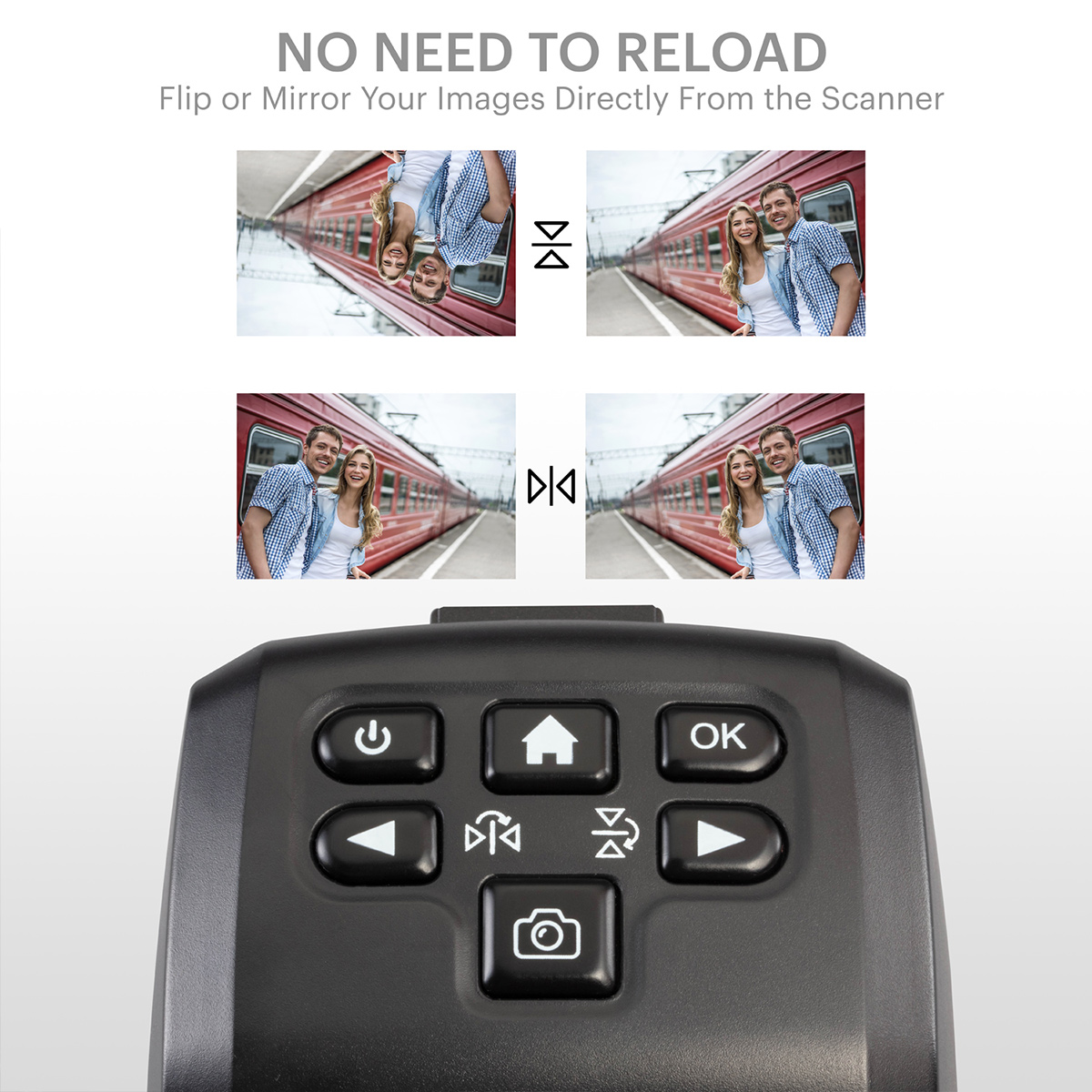 Compatible with 135, 126, 110, Super8, and Monochrome film and slides./ Adjustable brightness (±2.0 EV), RGB values, and reverse/ flip settings/ Built-in device memory stores up to 128MB of pictures/ Supports SD™ cards up to 32GB (not included)/ Included USB cable allows for quick and easy transfer of files to your home computer or laptop/ Use the included 3-in-1 international wall adapter to power your scanner from anywhere in the world