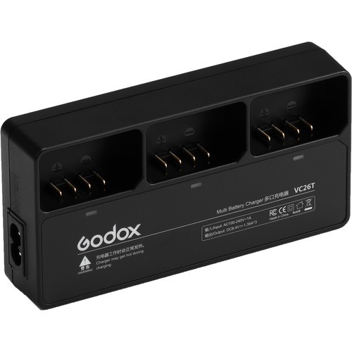 This Godox VC26T Multi-Battery Charger for V1 is an AC-powered battery charger designed for rechargeable Godox VB26 batteries. Designed for portability and easy operation, it can three charge batteries simultaneously.