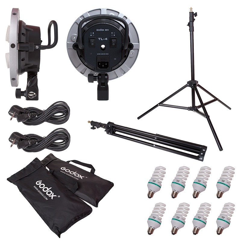 This Godox TL-4 Holder Tricolor Light Kit is a complete continuous lighting set, consisting of 2-4 fluorescent lamp holders for a total of 8 coil lamps, two light stands with a maximum height of 190cm, 2 soft boxes 50x70cm and a charger. The total light output of this set is 288 watts.
