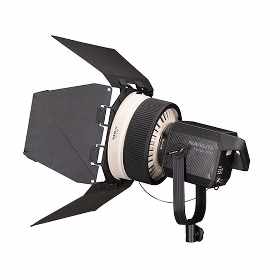 The FL-20G Fresnel Lens for Forza 500 from NanLite modifies the light's wide beam spread to an adjustable 10 to 45-degree flood-to-spot beam angle. The FL-20G Frensel features a standard Bowens-style reflector mount, so it may be attached quickly to the Forza 500 LED lights, and also to a wide variety of other Bowens-mount based light instruments. The included barndoors allow further beam spread adjustment to facilitate selective lighting. A padded carrying case is included for storage and transport.