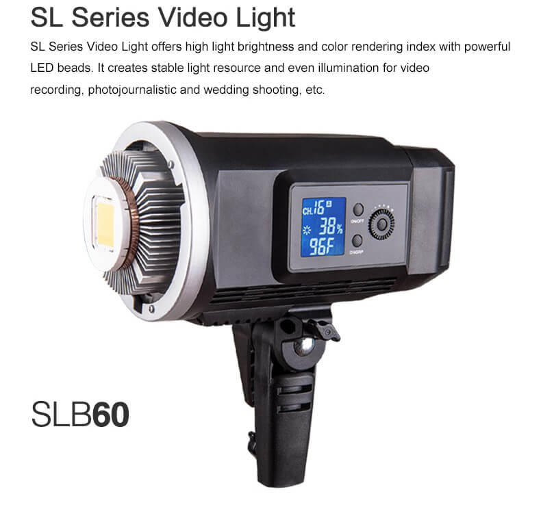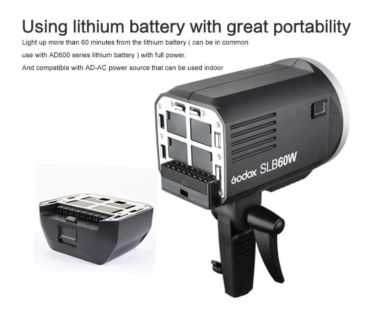 The SLB60W's lithium-ion battery will give you 60 minutes of run time on a full charge and you can charge a spare while shooting with a topped-up battery. There's also an optional AC power source for shooting in the studio or in places with available mains power. The SLB60W is stand mountable and has a Bowens front accessory mount, making it compatible with accessories from the many manufacturers who use this popular mount.
