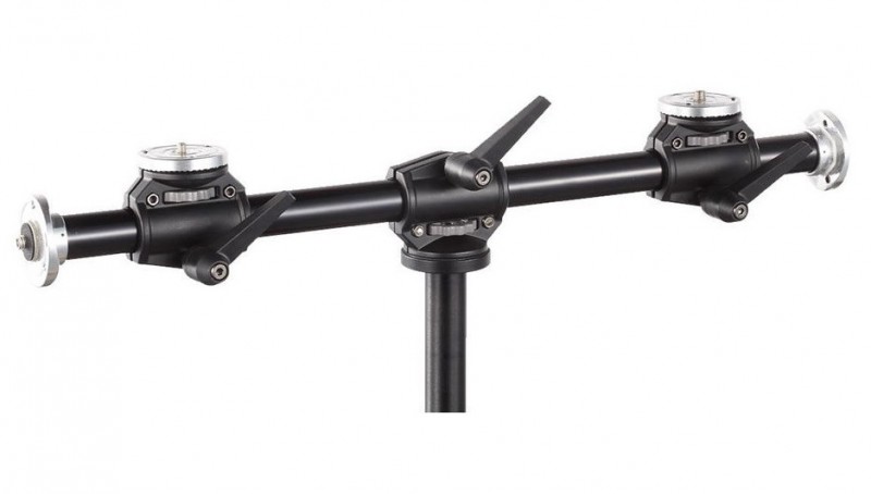 The Godox LSA-10 Dual Mount Arm has 4 separate mounting points, 2 heads on the sides of the arm and 2 heads at a 90 degree perpendicular angle. This arm makes it possible to mount 4 devices on a tripod or other base.