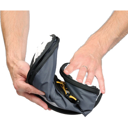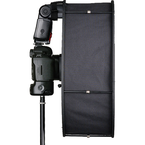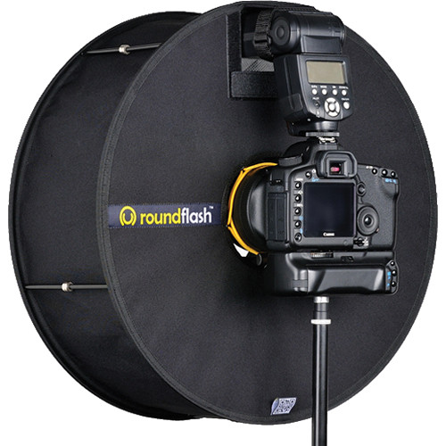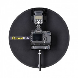 The RoundFlash fits most DSLRs with external flash units and easily attaches to the lens via a set of pentagonal shaped stretch cords and fixes securely to the flash unit with a touch fastener. The diameter of its internal hole is 4.3", so it is compatible with any lens with a diameter smaller than 4.0" (10 cm). It is designed to work with standard length and telephoto lenses and can work with wide-angle lenses, however some vignetting may occur depending on the lens. The RoundFlash diffuser opens easily and is supported in its open position by five foldable magnetic sticks. It collapses and folds down to fit into an included 6.3 x 7.9" pouch.