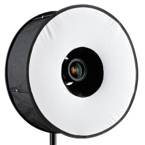 The Magnetic Ringflash Adapter from Roundflash is a portable, collapsible ring light that attaches to the lens of your DSLR with an external flash attached and provides a bright, evenly diffused light that is effective for portraits and for macro shooting. Due to its large diameter and internal mirrored construction, RoundFlash provides soft and flattering lighting without hotspots, heavy shadows or dark areas on the front surface. The diffuser works with your speedlight to provide the light output you desire. It is ideal for portrait work because of the diffused light it supplies but also works well for macro shooting due to its placement on the lens.