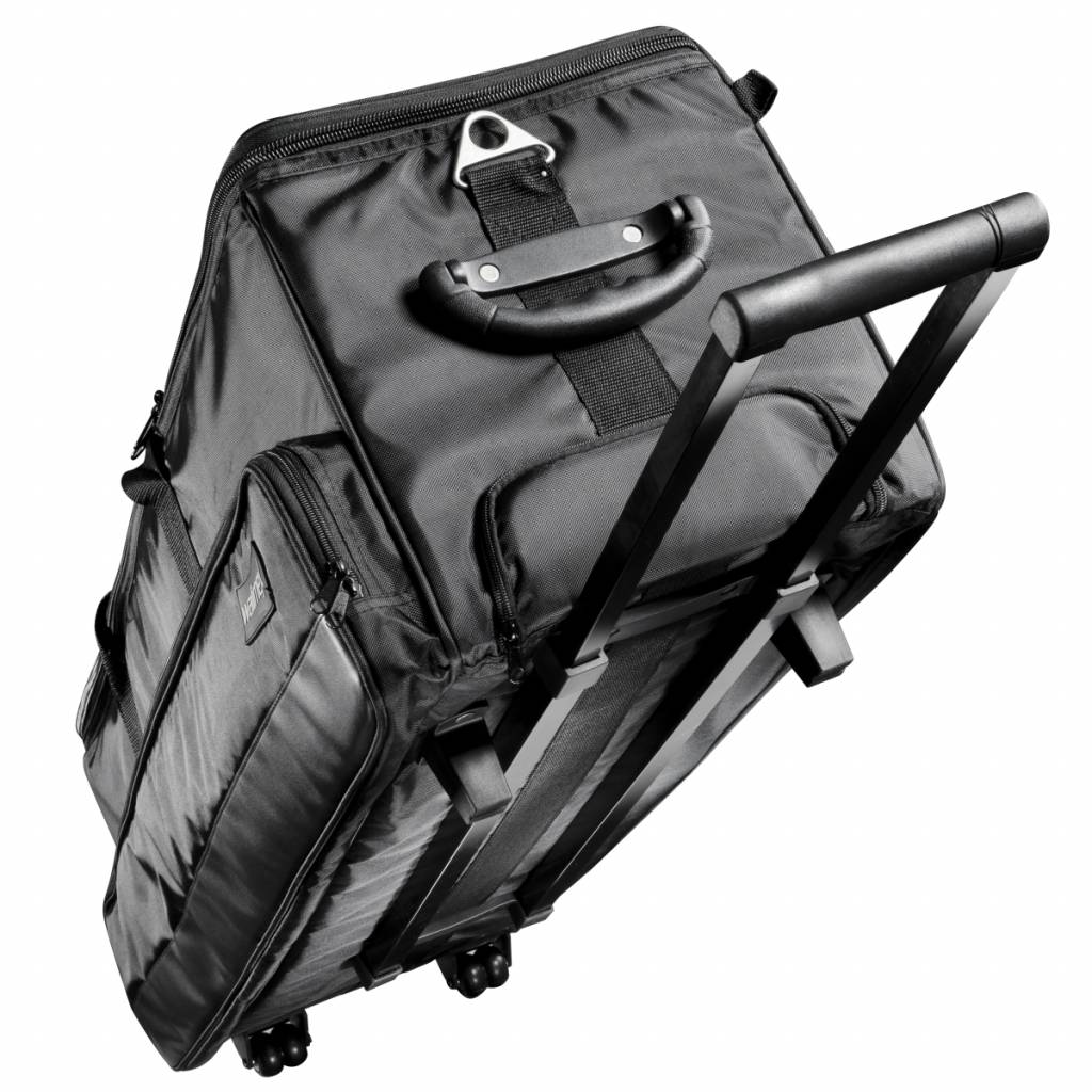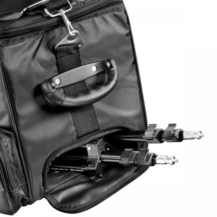 The studio bag has two hard rubber rollers and can either be pulled using the pull-out trolley handle or the ergonomically shaped handle. There is a length-adjustable, padded shoulder strap for carrying it (which can be removed from the carabiners) and, alternatively, a hand strap on the bag. To protect your equipment, there are sturdy plastic protectors on the bottom of the bag.