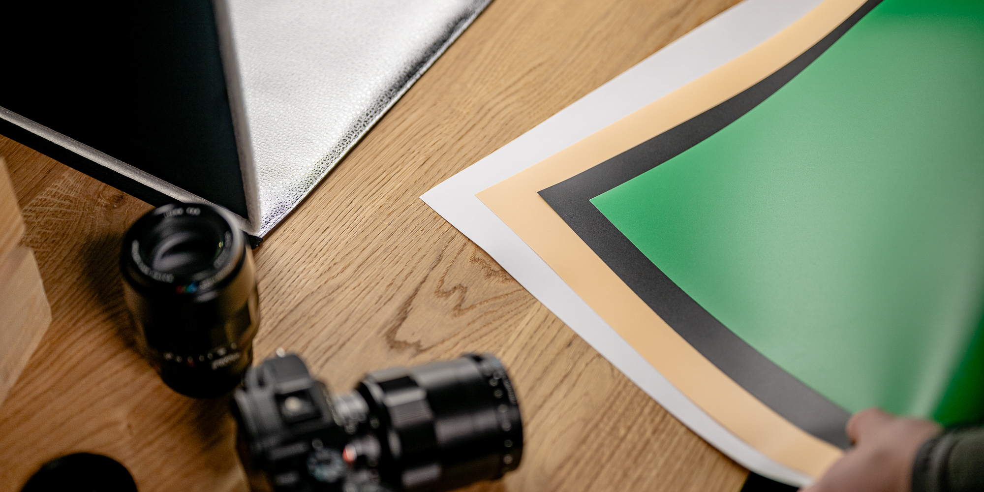 4 different coloured backgrounds (white, black, beige, green) made of durable PVC