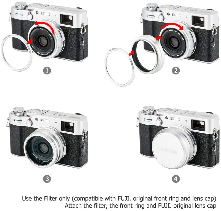 The L39 coating can eliminate UV light with a wavelength shorter than 390nm. The 19-layer coating on each surface of the glass reduces reflections. Anti-scratch, anti-static, oil and water- resistant. The light transmission is up to 99.5% or above. Made of high quality aluminium alloy and optical glass. The integrated design of the filter and adapter ring avoids repetitively mounting and dismounting the filter, also providing the camera with better image quality and additional protection. Compatible with Fujifilm original front ring