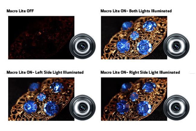 The built-in front-facing Macro Lite LED can be used to provide additional illuminations to subjects when working at close distances. The light can be configured to illuminate only the right or left side, or both sides, in order to produce greater visual depth and reduce shadows caused by the close proximity of the lens to the subject.
