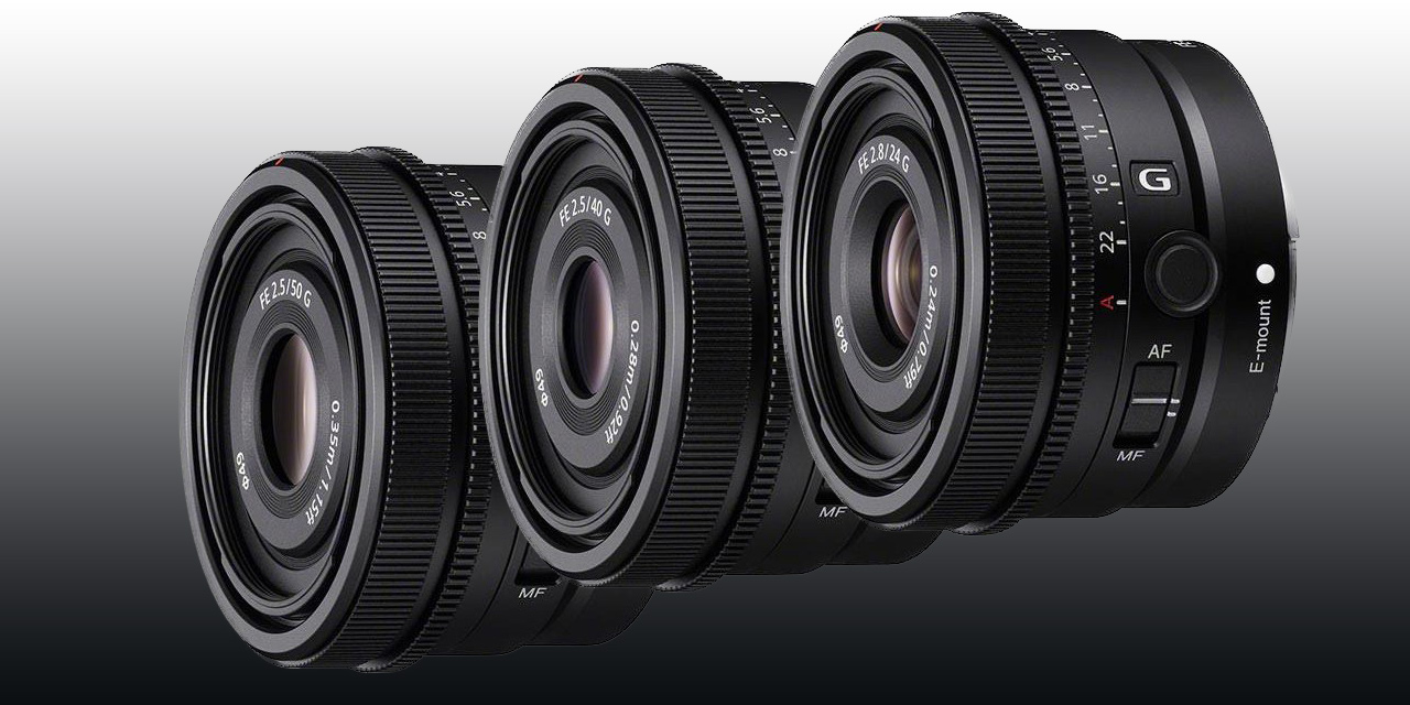 The focal lengths are FE 50mm F2.5 G, FE 40 F2.5 G, and FE 24mm F2.8 G. The lenses share the same filter diameter (49mm) and are almost all the same weight (FE 50mm F2.5 G 6.1 oz, FE 40mm F2.5 G 6.1 oz and FE 24mm F2.8 G 5.7 oz), allowing the user to easily switch between all three lenses when using a gimbal without needing to rebalance each time. Moreover, each lens focuses internally, which means the front element does not move in and out to focus, enabling all three lenses to balance well when using a gimbal. They all feature the same stylish exterior design with focal lengths that are clearly marked to easily switch from lens to lens.