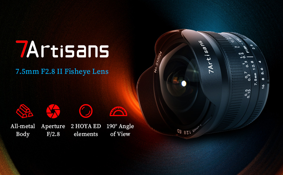 With an expansive 190° angle of view, the 7.5mm f/2.8 II Fisheye Lens for Sony E from 7artisans is an all-manual lens capable of producing unique perspectives and creative distortions. The lens's f/2.8 maximum aperture benefits working in a variety of lighting conditions while maintaining a small and lightweight form factor for handheld shooting. The optimized 11-element, 9-group features a higher refractive index is used in the front glass group, while the rear group of optical glass is crafted from HOYA ED glass, which effectively reduces chromatic aberration, while improving image quality when compared to the original lens design. Multi-layer coatings have been applied to individual glass elements to suppress flare and ghosting for improved contrast and color fidelity when working in strong lighting conditions. The lens has an all-metal body and features a built-in petal-shaped lens hood to help reduce flare while protecting the front element.
