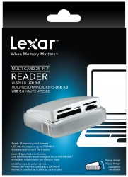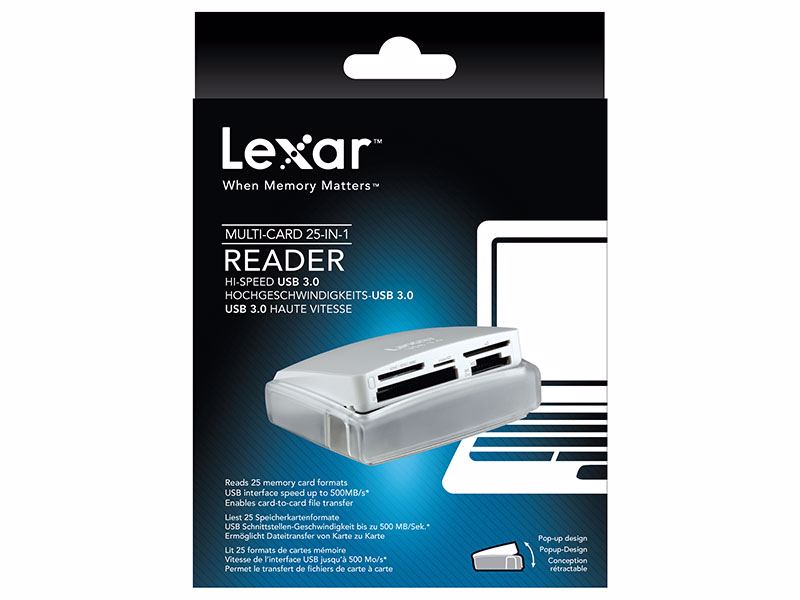 The Lexar® Multi-Card 25-in-1 USB 3.0 Reader is an easy-to-use, all-in-one file transfer solution. The reader has an innovative pop-up design, supports 25 memory card formats,* and enables concurrent downloads and card-to-card file transfer.