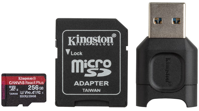 microSD cards»KINGSTON»Kingston Canvas React PLUS microSD card 256 Gb. R285/W165 MB/s V90 UHS-II U3 + SD adapter + USB-adapter»(new)