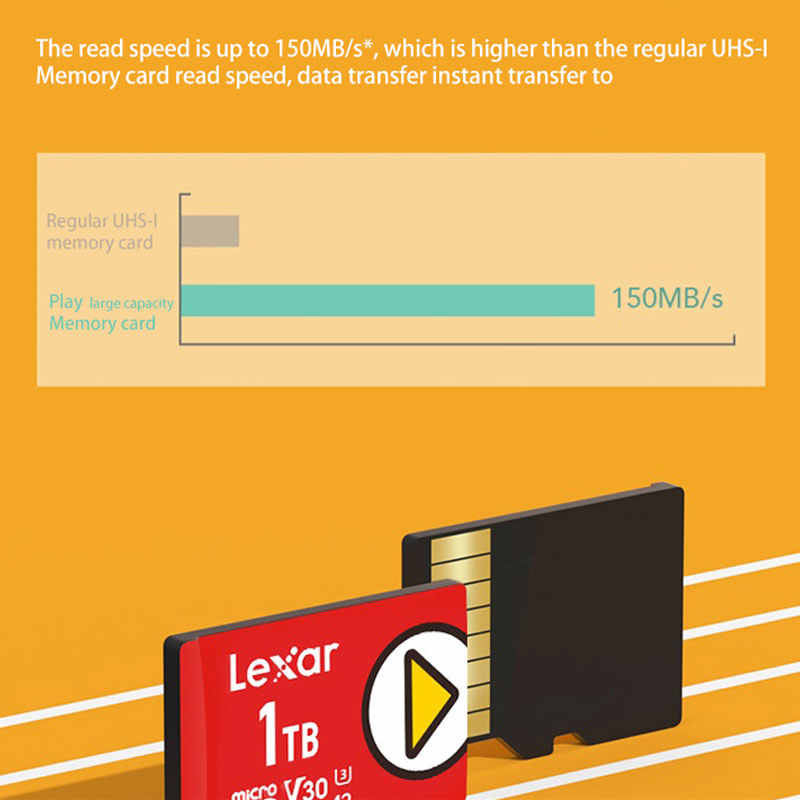 Perfect mobile memory solution for media entertainment Lexar® PLAY microSDXC™ UHS-I cards are designed to keep up with all your content, no matter if they are games, movies, music or books. Avoid slow load times with read speeds of up to 150MB/s and fast A1 or A2-rated performance, so you can play more of what you love without missing a beat. With large capacities up to 1TB you can save all your favorite multimedia files. Ideal for portable gaming devices, smartphones, and tablets.
