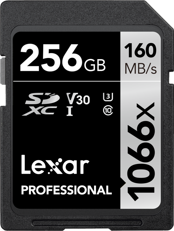 High-speed performance when you need it most. Designed for your DSLR or mirrorless camera, the Lexar® Professional 1066x SDXC™ UHS-I Card SILVER Series lets you quickly capture and transfer high-quality photos, including Full-HD and 4K UHD video, with read speeds of up to 160MB/s and write speeds of up to 120MB/s1. This dramatically accelerates workflow from start to finish maximizing your creativity.