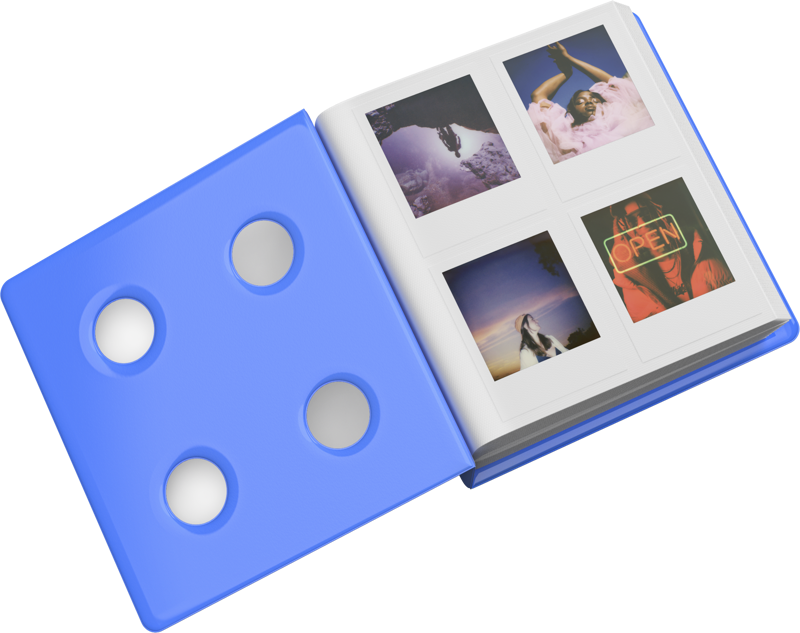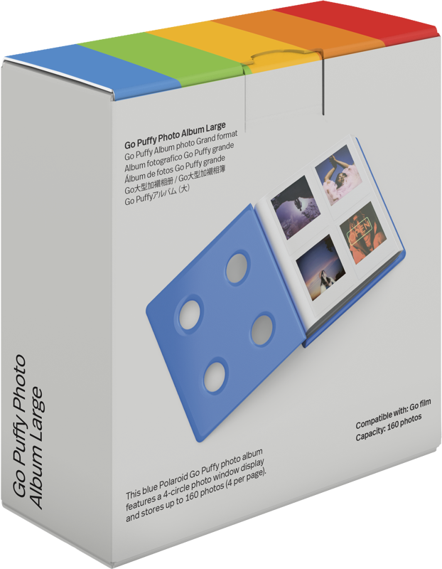 Visbeidzot visi trīs koncepti ir apvienoti šajā Polaroid Go Puffy fotoalbumā. Šis albums ar rotaļīgi pūkainu albuma vāku ar personalizējamu 4 apļu fotoattēlu logu ir pirmais Polaroid Go fotogrāfiem. Tas ir zilā krāsā, un tajā var glabāt līdz 160 Polaroid Go fotogrāfijām (4 uz lapas).
