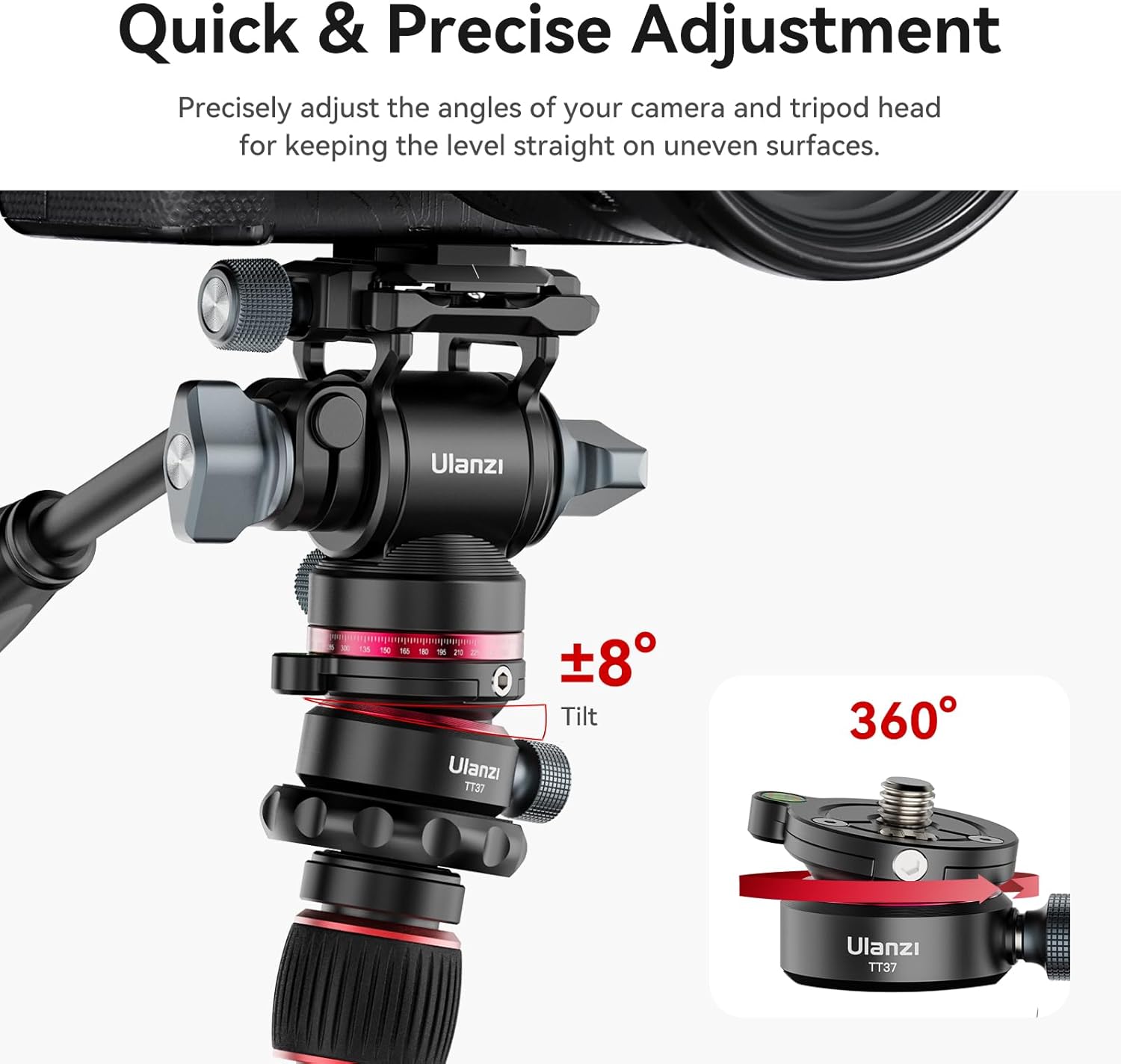 The Ulanzi TT37 Mini Leveling Base For Tripod Head is a camera leveler for a tripod head. It is made of aluminium and adjustable with -8°/+8° tilt, spirit level, 1/4‘3/8’ screw. It is compatible with Canon, Nikon, Sony, DSLR & Camcorder.