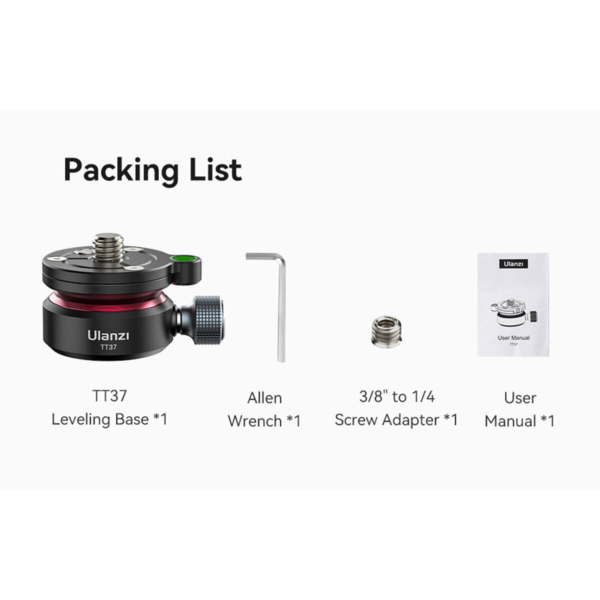 The Ulanzi TT37 Mini Leveling Base For Tripod Head is a camera leveler for a tripod head. It is made of aluminium and adjustable with -8°/+8° tilt, spirit level, 1/4‘3/8’ screw. It is compatible with Canon, Nikon, Sony, DSLR & Camcorder.