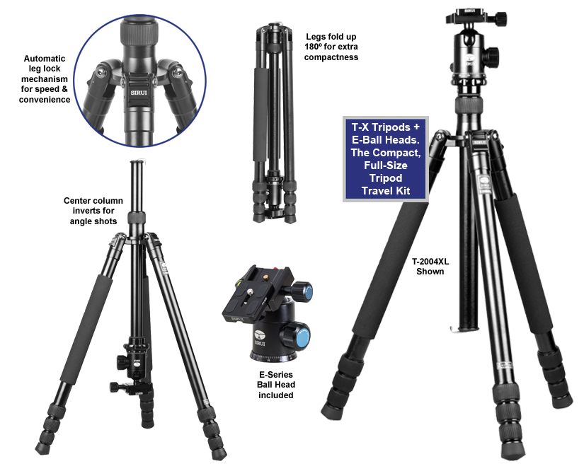 The T-XL Series tripod has a uniquely designed leg mechanism that allows you to move the legs up 180°. This allows the tripod to be folded significantly smaller than comparably sized tripods with conventional leg designs. Simply depress the leg angle lock and invert the legs 180°. An added advantage is that you can keep a ball head on the tripod and it will still fit in the compact case.