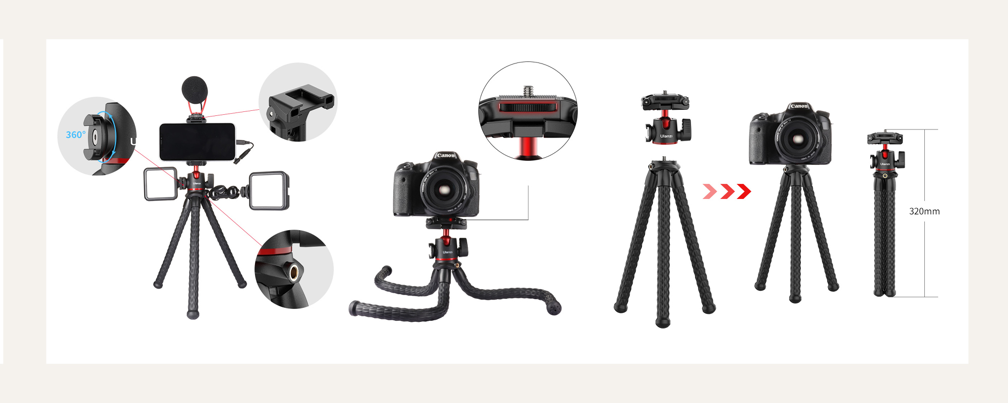 1/4″ thread for connecting additional accessories (e.g. a magic arm) to the tripod