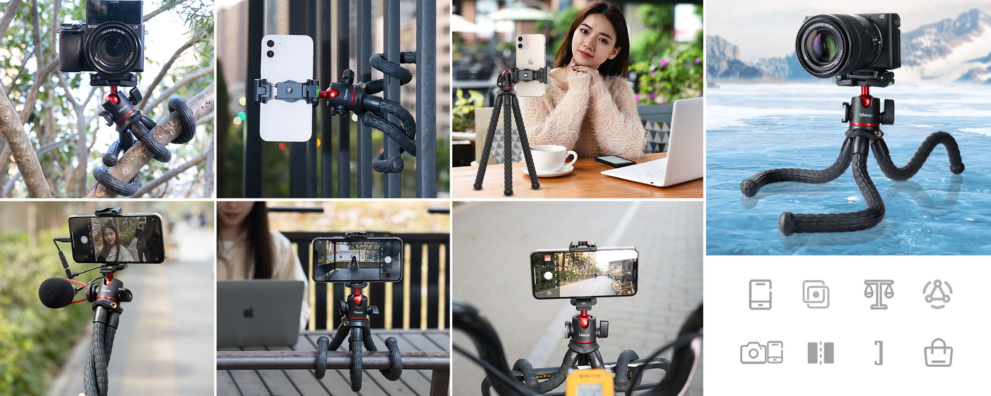 The Ulanzi MT-33 flexible tripod is equipped with a precision ball head that allows you to quickly set the perfect frame, whether you’re shooting vertically or horizontally. With it, you can easily take selfies, record vlogs or prepare for video conferences, even when space is limited. You can mount both a camera (1/4″ thread) and a smartphone (grip) on the tripod. Full freedom of adjustment means that the equipment always adapts to your working style, not the other way around.