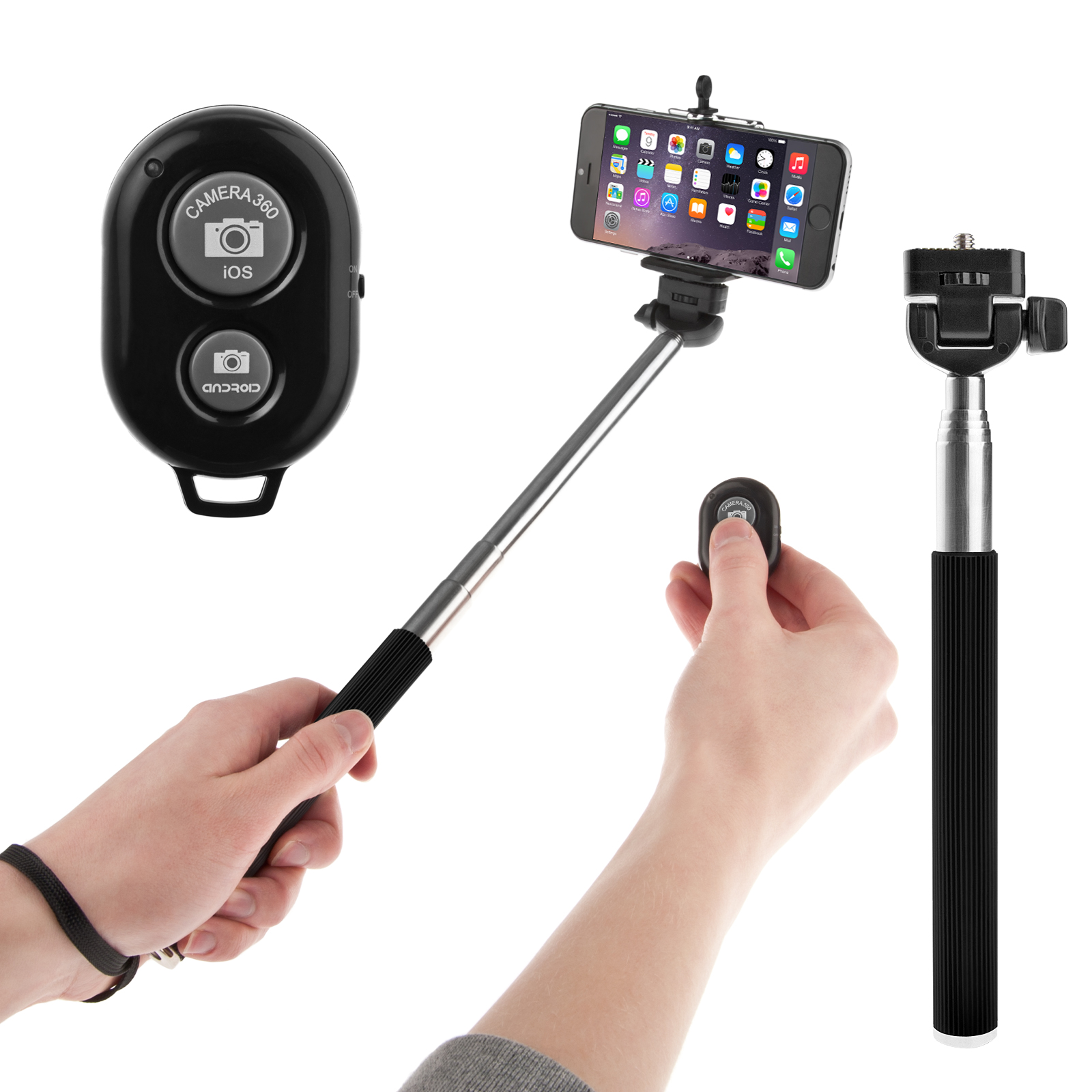 - Bluetooth connectivity - Lightweight and portable - Easily extendable and retractable - Multi-angle - Extremely durable - Supports PTZ cameras - non-slip wrist strap - Material: Stainless Steel - Extension/retraction range: 20-100cm - Bluetooth version: 3.0 + EDR - Applicable range: suitable for mobile phones, digital cameras, miniature SLR cameras and similar devices with a width of 55-85cm - Supported systems: IOS / Android system - Power: 1 - CR2032 battery - Weight: 145g