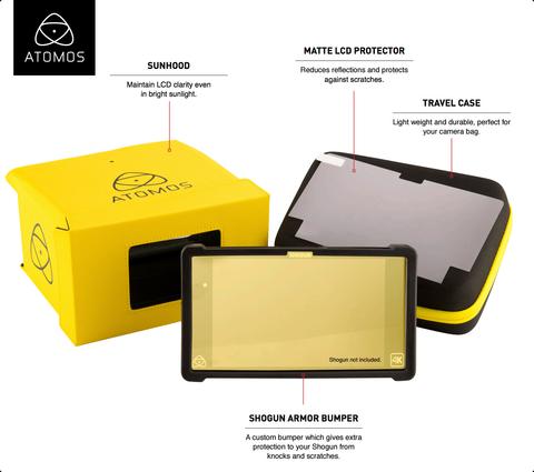 Assembled from components designed specifically for your Atomos Shogun, the Yellow Shogun Action Pack from Atomos protects and enhances the usability of your Shogun monitor/recorder. The kit includes a non-adhesive screen protector and rubberized armor chassis for protection from knocks, bumps, and scratches. The included sunhood protects the screen from direct sunlight and veiling glare, and the travel case can carry your Shogun and a variety of accessories.