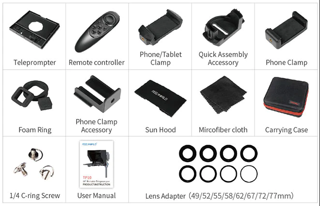 FEELWORLD TP10 is a folding and portable teleprompter which feature with 10-inch standard beam splitter allows you to clearly read scrolling text while looking directly into the camera, perfect for vlog, live broadcast, online class, video recording, interviews, video studio, news and presentation. No need to recite the script, confidence and charming! It can be prompted via smartphone or tablet while DSLR camera or phone is shooting. Supports wide angle lens, Android/iOS app, Bluetooth remote control, easy to operate, make the video production more efficient. Use with exquisite special storage case, more convenient to carry. It is ideal for video, program creator.