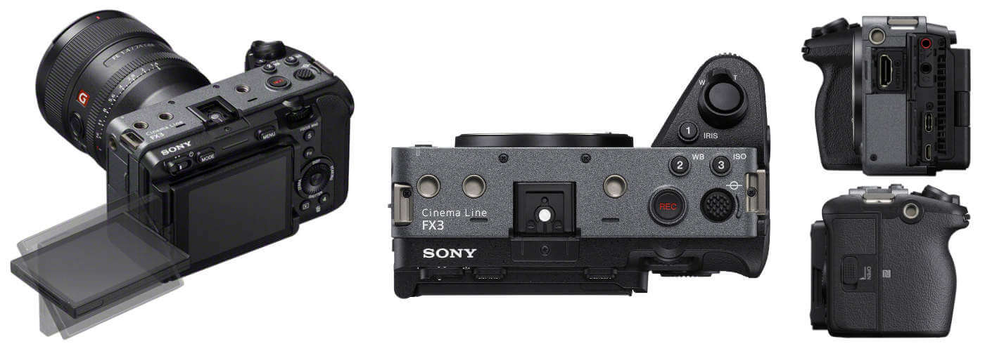 With a compact design for solo shooters, travel applications, and to serve as an ideal B cam, the Sony FX3 borrows from both the Cinema Line and Alpha series of cameras to create an optimized portable cinema camera. The FX3 features all of the imaging attributes you'd expect from this class but sports a newly designed body that's hand-holdable, with a streamlined and minimal profile, and has a "cage-free" design, indicating the ability to secure various accessories directly to the camera body.