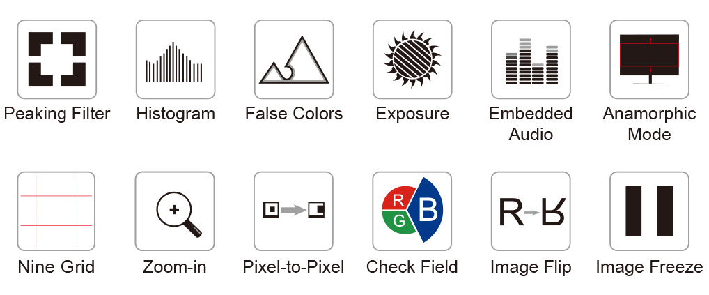 Despite the compact form factor, the Feelworld T756 offers many useful functions that are useful in many different types of workflows. Various control functions such as focus peaking, zoom and 1: 1 pixel mapping help in obtaining sharp images. In addition, the monitor offers functions such as anamorphic mode, image flip and nine grid. Other useful professional features are histogram, false colors and check field with which you can check the exposure and color balance.