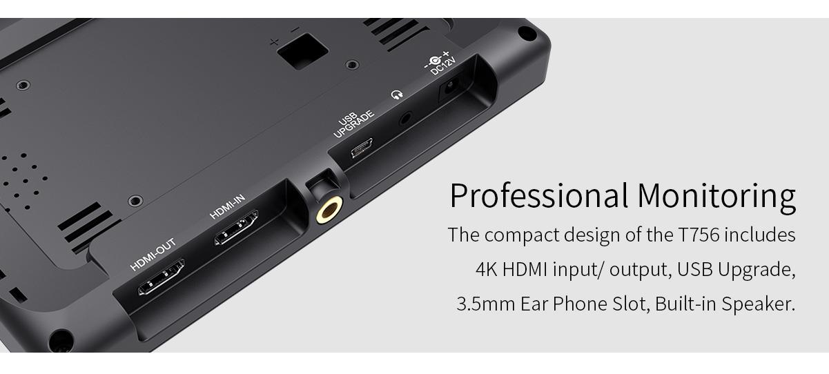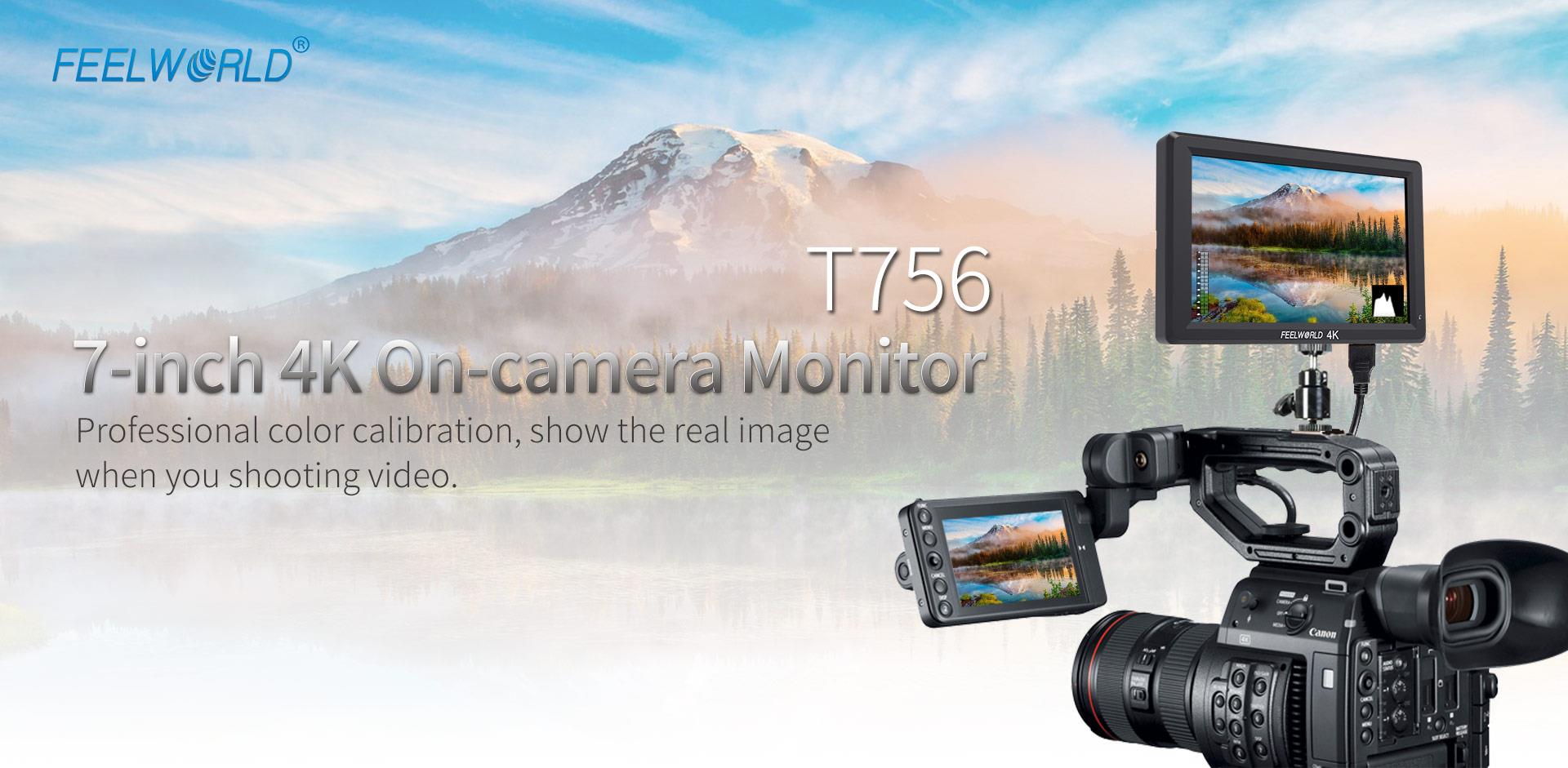 The monitor comes with an HDMI cable, lens hood, mini-headset with hotshoe mount and NP-F series battery plate. Whether you're filming or shooting with an SD digital video camera, HD camcorder, DSLR or 4K system camera, the Feelworld T756 always displays the images perfectly and razor sharp.