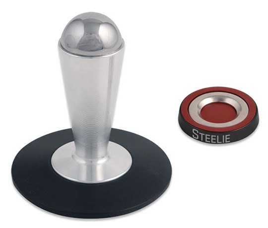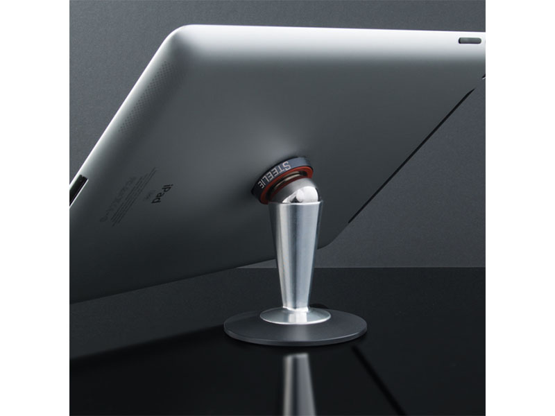 The Steelie Pedestal Kit is simple, versatile, and infinitely convenient. Its clean design and strong magnetic composition makes it easy to dock and re-dock your tablet on desks, countertops, tables, nightstands, floors - any smooth, flat surface. The Steelie Pedestal Kit uses two unique components to create this interactive viewing pedestal. The Steelie Tabletop Stand Component is a machined aluminum podium that fits tightly into a durable plastic base with silicone grips to create a stable platform. At the top of the stand is a steel ball which magnetically engages the Magnetic Tablet Socket to create the complete Steelie Pedestal Kit. The Magnetic Tablet Socket Component is also a strong, machined aluminum base that contains a powerful, circular magnet, ringed and centered with flexible silicone and backed with 3M®'s VHB™ adhesive foam tape. Simply peel and attach it securely to the center of the back of your tablet, or its rigid case. When magnetically connected to the Tabletop Stand, the Steelie Magnetic Tablet Socket's silicone sections create a smooth glide and firm grip, so you can easily rotate the device from landscape to portrait position and it stays that way until you turn it again.