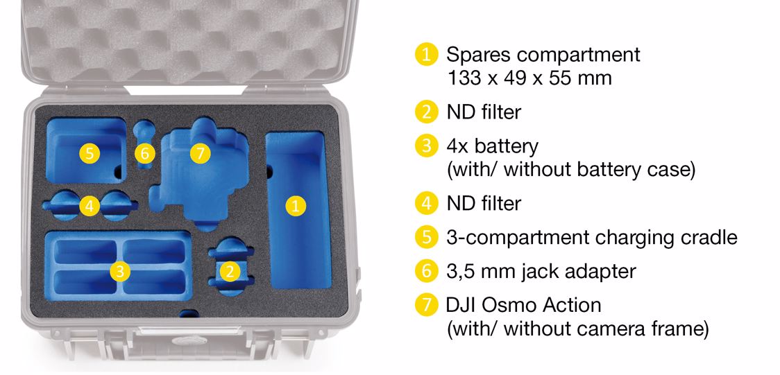- The Type 1000 with DJI Osmo Action Inlay offers space for a DJI Osmo Action and further equipment. The ActionCam can be transported with or without camera frame. 4 recesses allow the safe transport of DJI Osmo Action batteries. The batteries can be carried with or without battery case. The design of the inlay enhances to charge 3 batteries in the 3 compartment charging cradle directly in the case, which also allows the transport of 3 additional batteries. Thus the case offers space for up to 8 batteries. Furthermore 4 ND filters fit in the case. A spares compartment with the dimensions 133 x 49 x 55mm offers space for additional accessories.