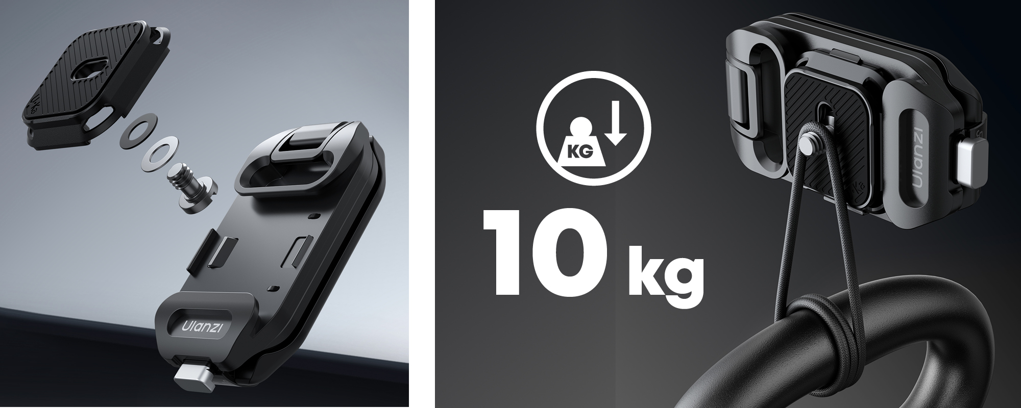 The Ulanzi UKA07 is an ultra-durable mount with a quick-release plate that allows you to attach your camera or camcorder to a backpack strap or belt. Thanks to its special double-lock design and quick-release system, you can always have your equipment at hand – without having to carry it around your neck or in your hands. The mount is extremely compact and lightweight (only 94 g), yet designed to hold equipment weighing up to 10 kg. It is the perfect choice for photographers, vloggers and creators who are constantly on the move.