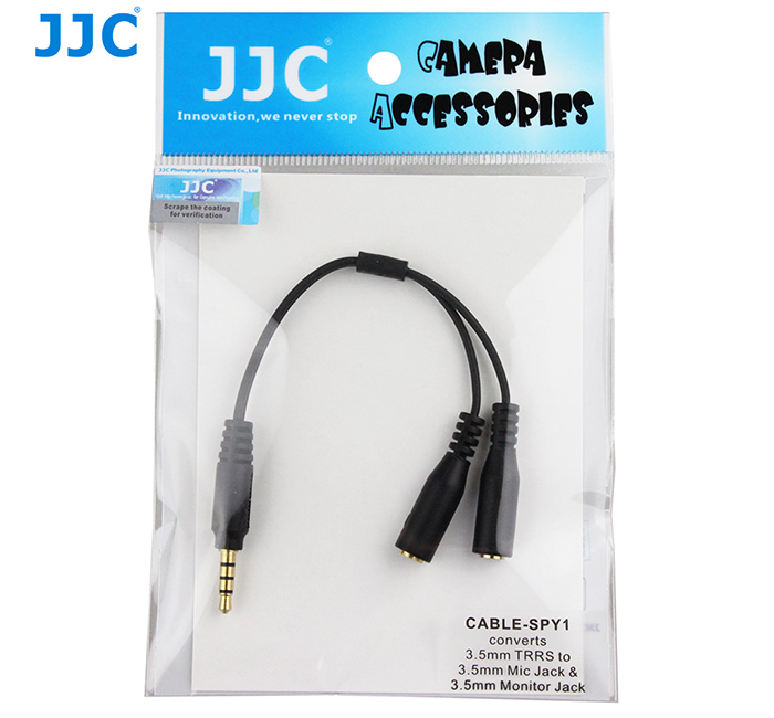 JJC Cable-SPY1 is designed for cellphones that has a 3.5mm TRRS jack(CTIA Standard). It converts your cellphone’s 3.5mm TRRS jack to 3.5mm Mic Jack & 3.5mm Monitor Jack, one allows you connect a microphone such as JJC SGM-38 or other similar microphones. Another one allows you connect a headphone. In this way, you can use your cellphone to create more wonderful audios and videos.